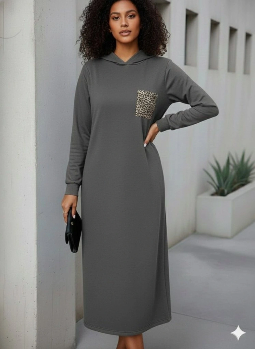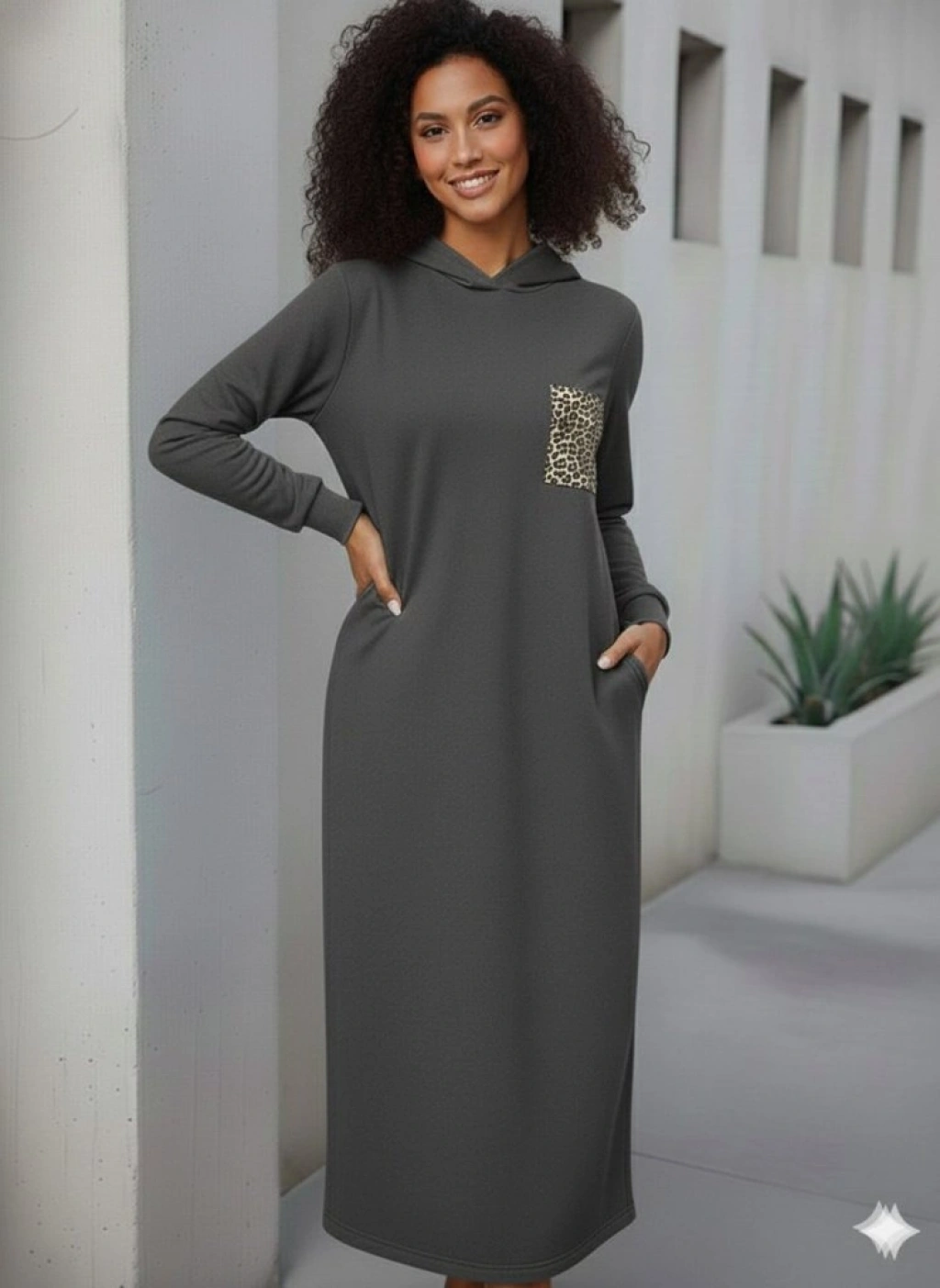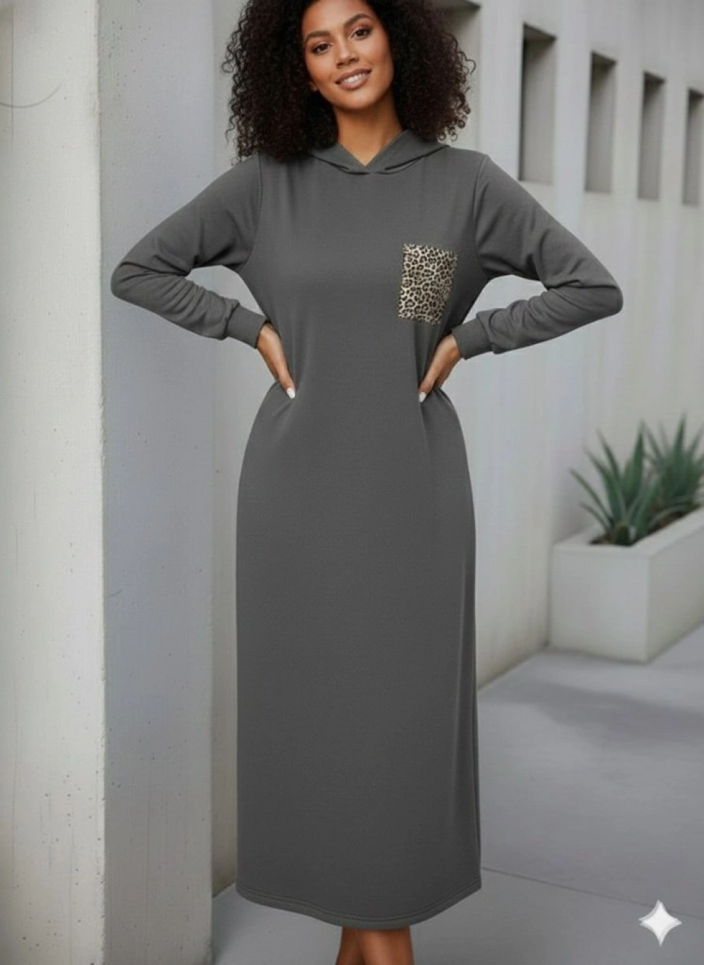 Kadın Uzun Kollu Kapşonlu Cep Detaylı Viskon Iki Iplik Maxi Elbise