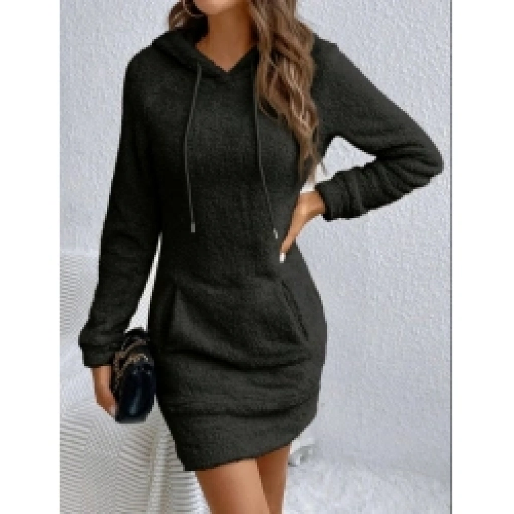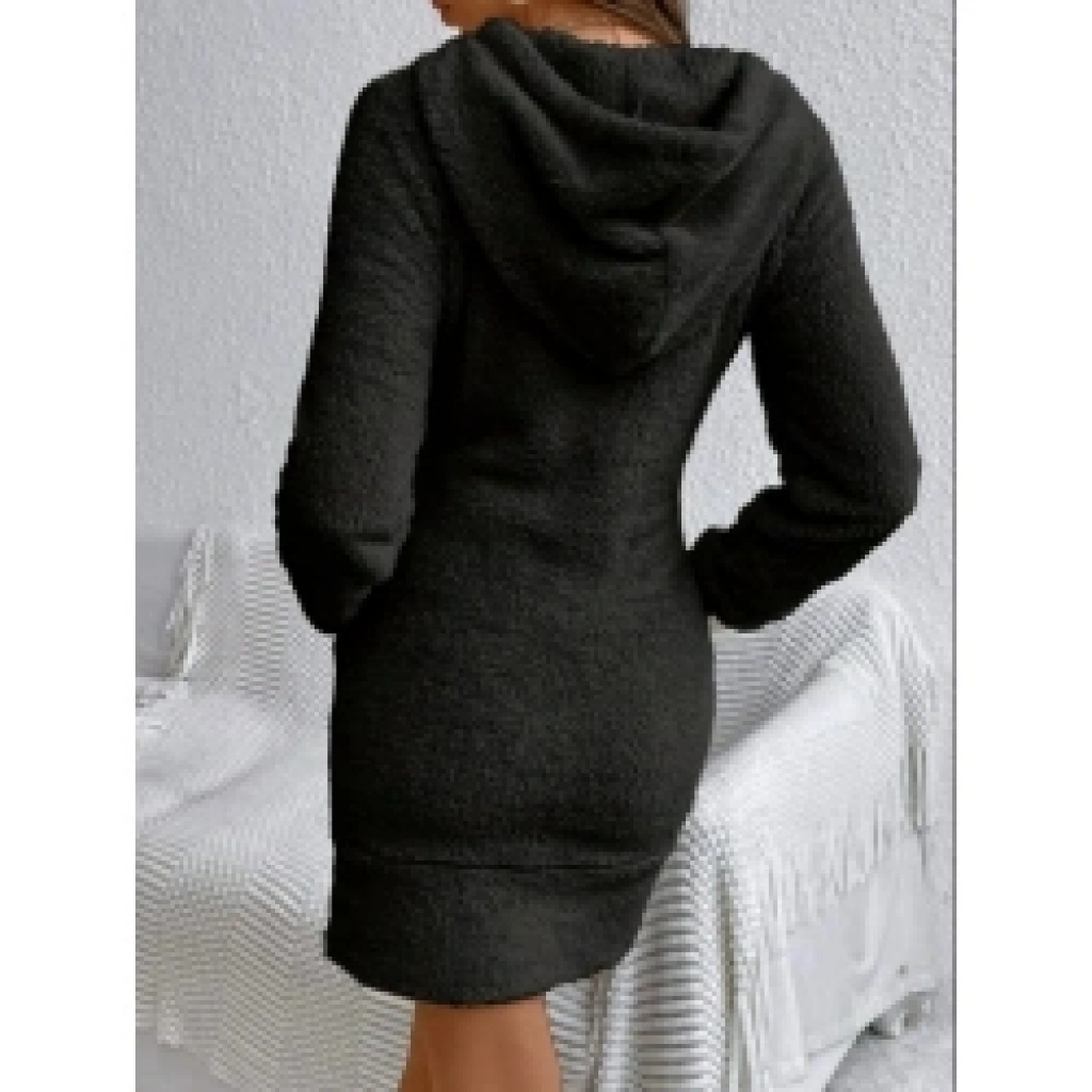 Kadın Uzun Kollu Kapşonlu Cepli Mini Peluş Elbise