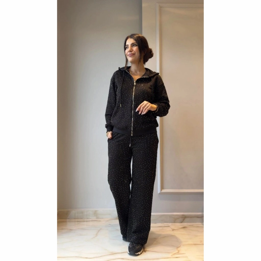 Kadın Uzun Kollu Kapşonlu Fermuarlı Taşlı önü Fermuarlı Viskon Iki Iplik Bluz Ve Eşofman Altı Ikili Takım