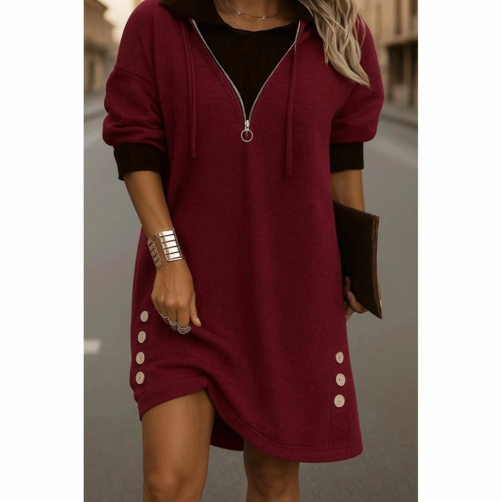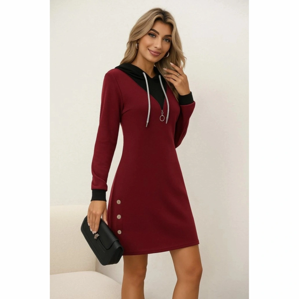 Kadın Uzun Kollu Kapşonlu önden Fermuarlı Düğmeli Mini Iki Iplik Elbise