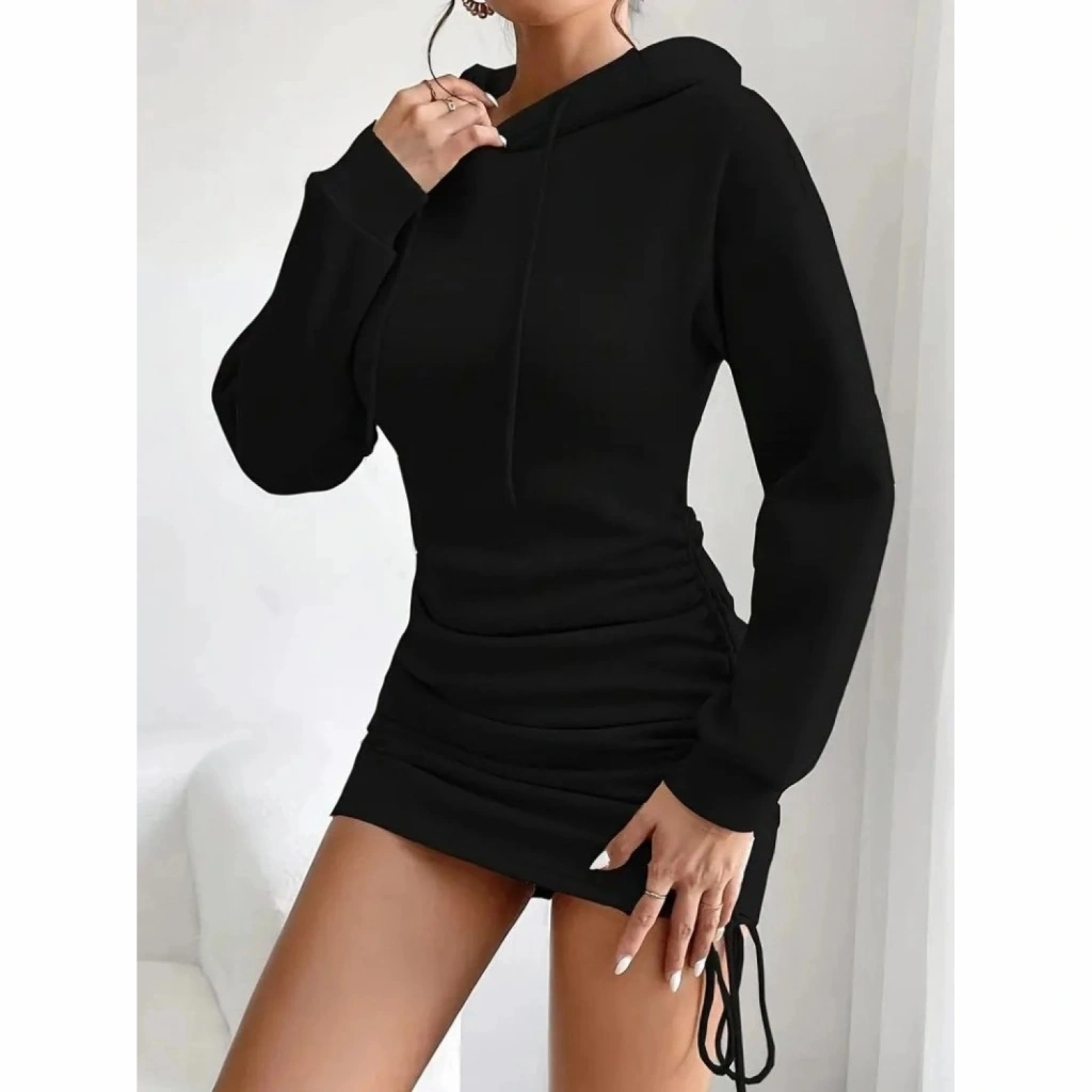 Kadın Uzun Kollu Kapşonlu Yandan Büzgülü Mini Viskon Iki Iplik Elbise