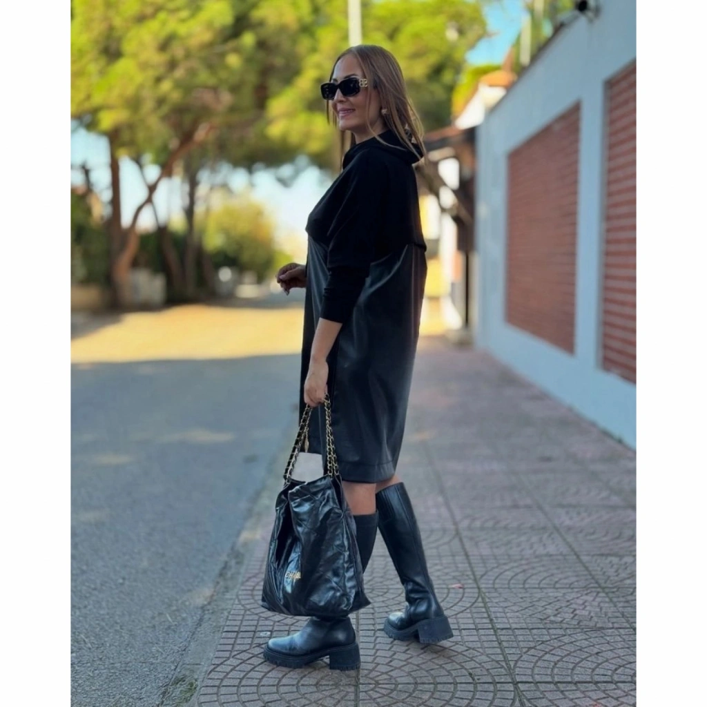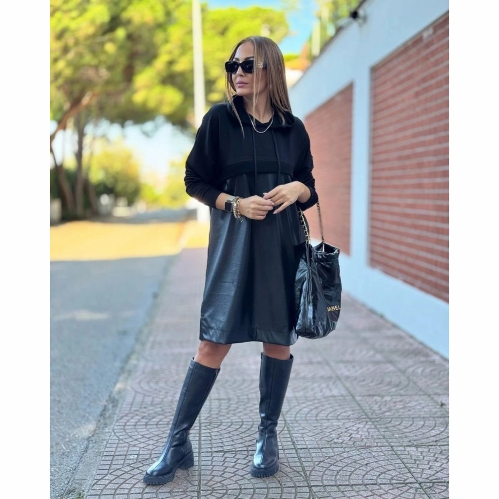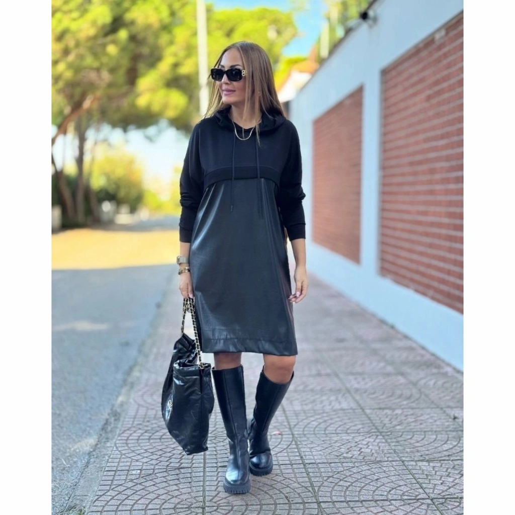 Kadın Uzun Kollu Kapüşon Ve Deri Detay Diz üstü Elbise