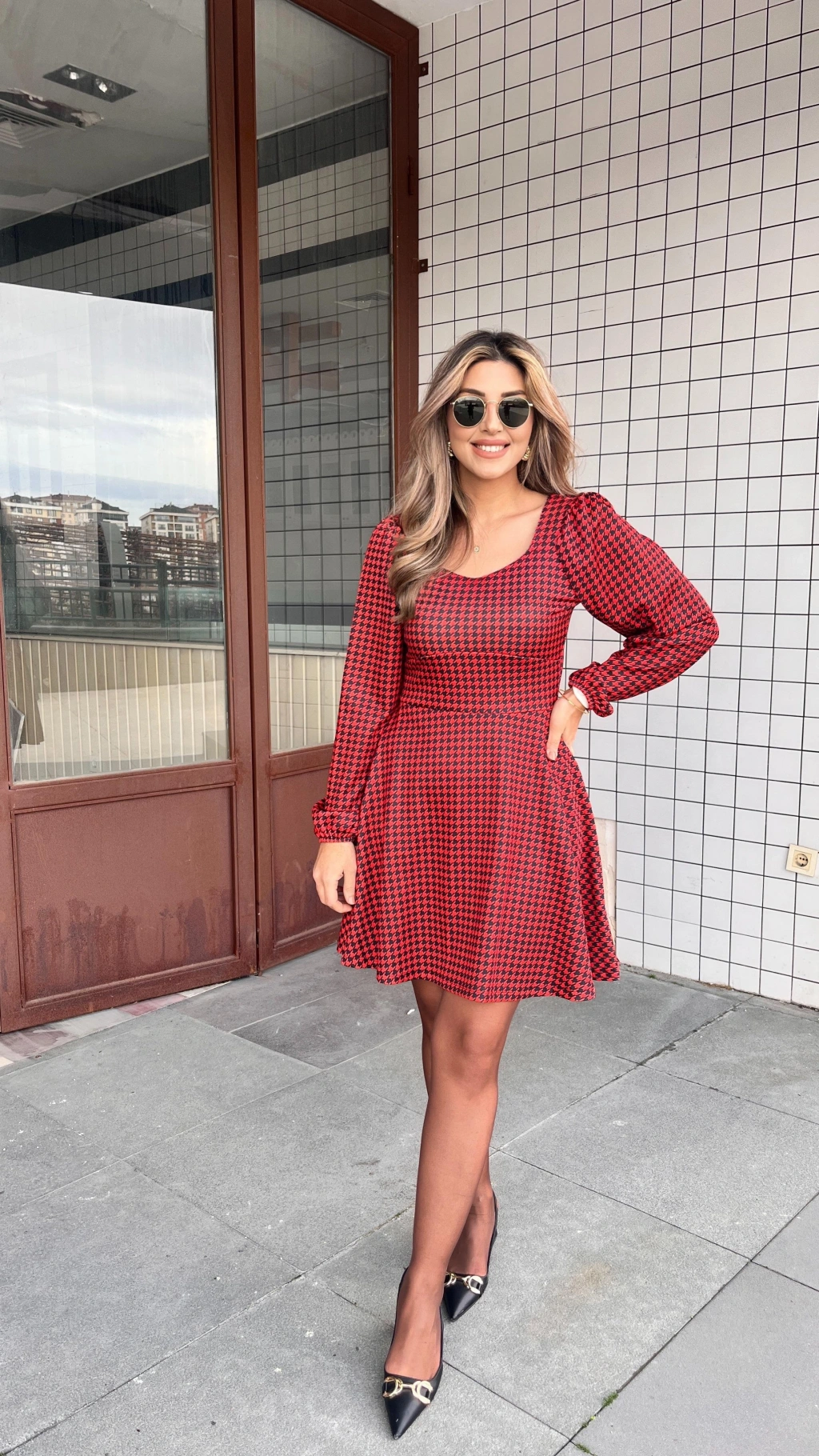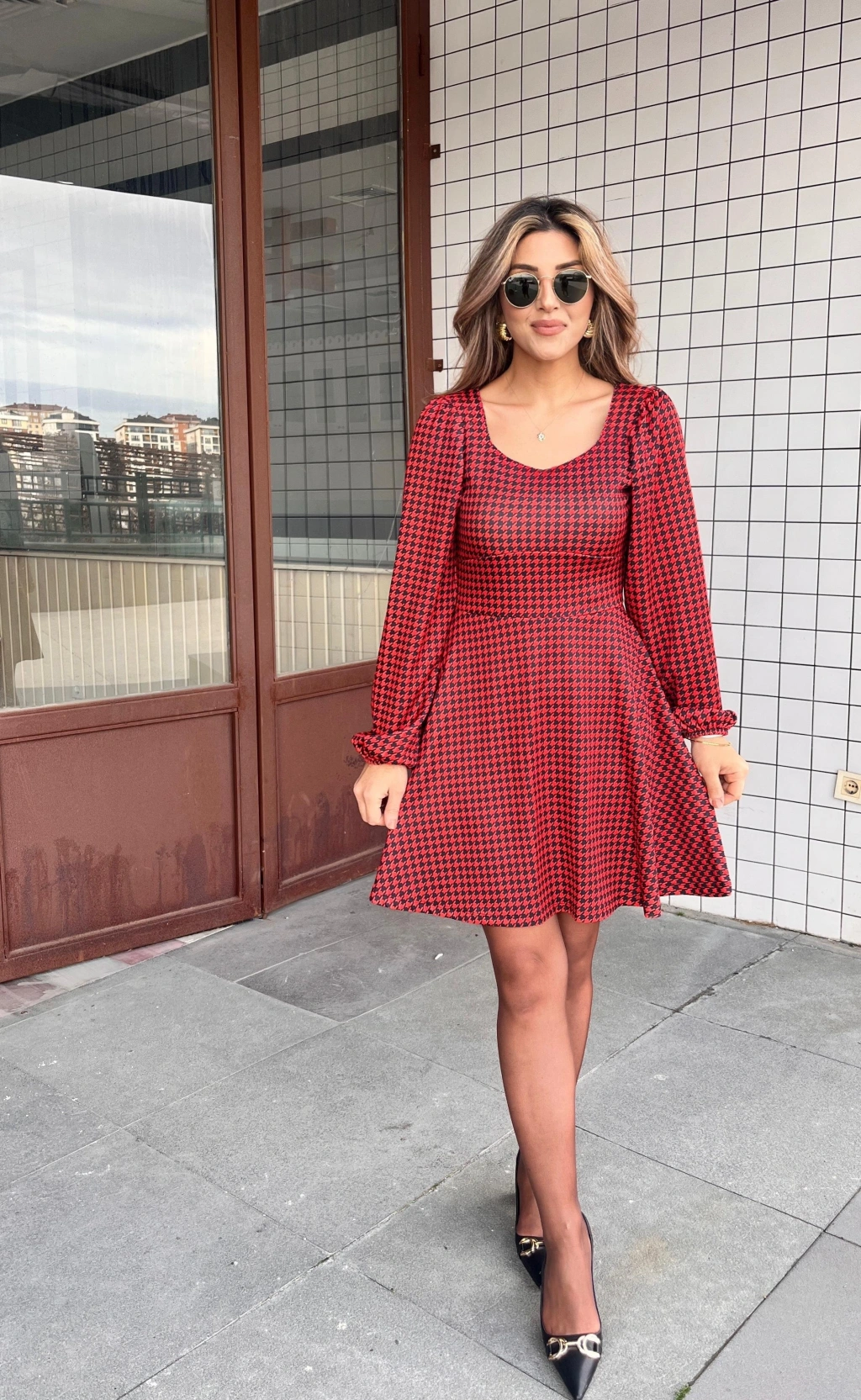 Kadın Uzun Kollu Kare Kalp Yakalı Mini Modal Elbise