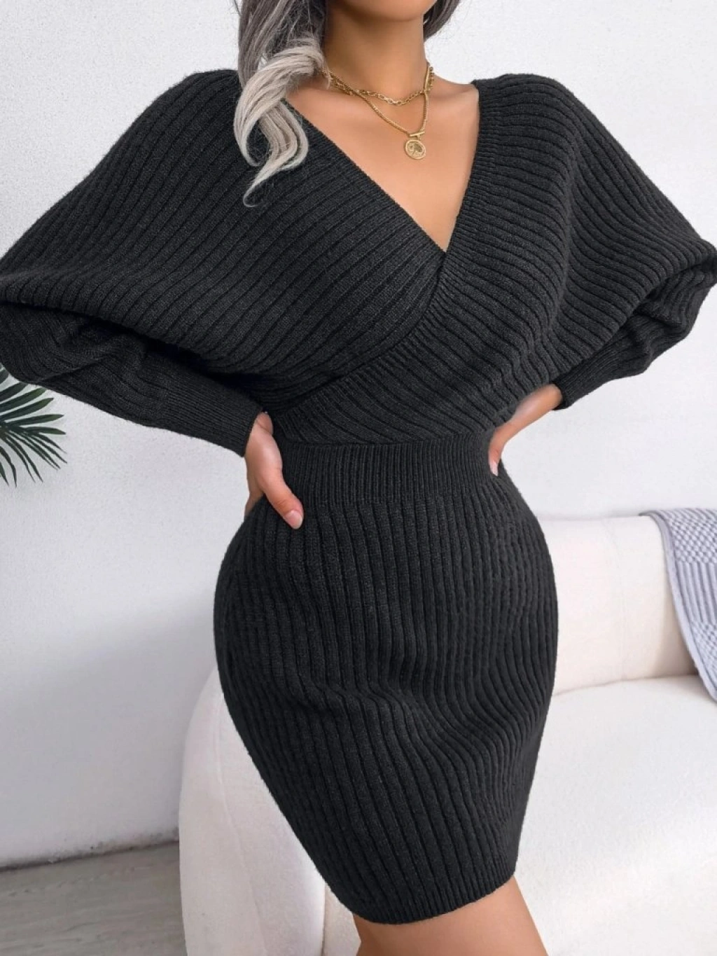 Kadın Uzun Kollu Kruvaze Geniş Yakalı Mini Triko Elbise