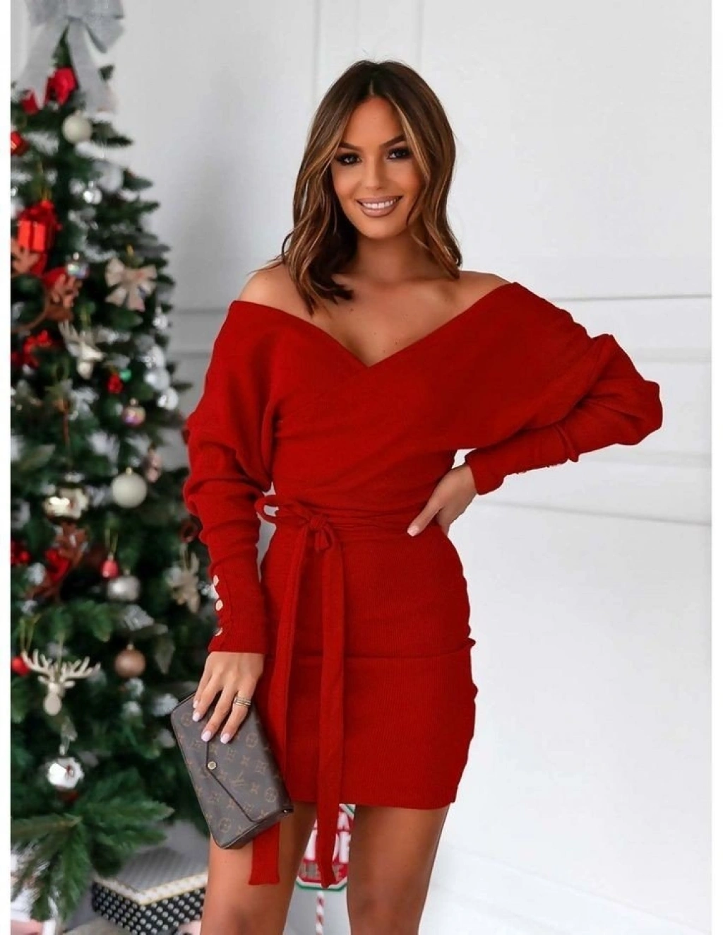 Kadın Uzun Kollu Kruvaze Yaka Bağcık Detay Akrilik Mini Boy Elbise