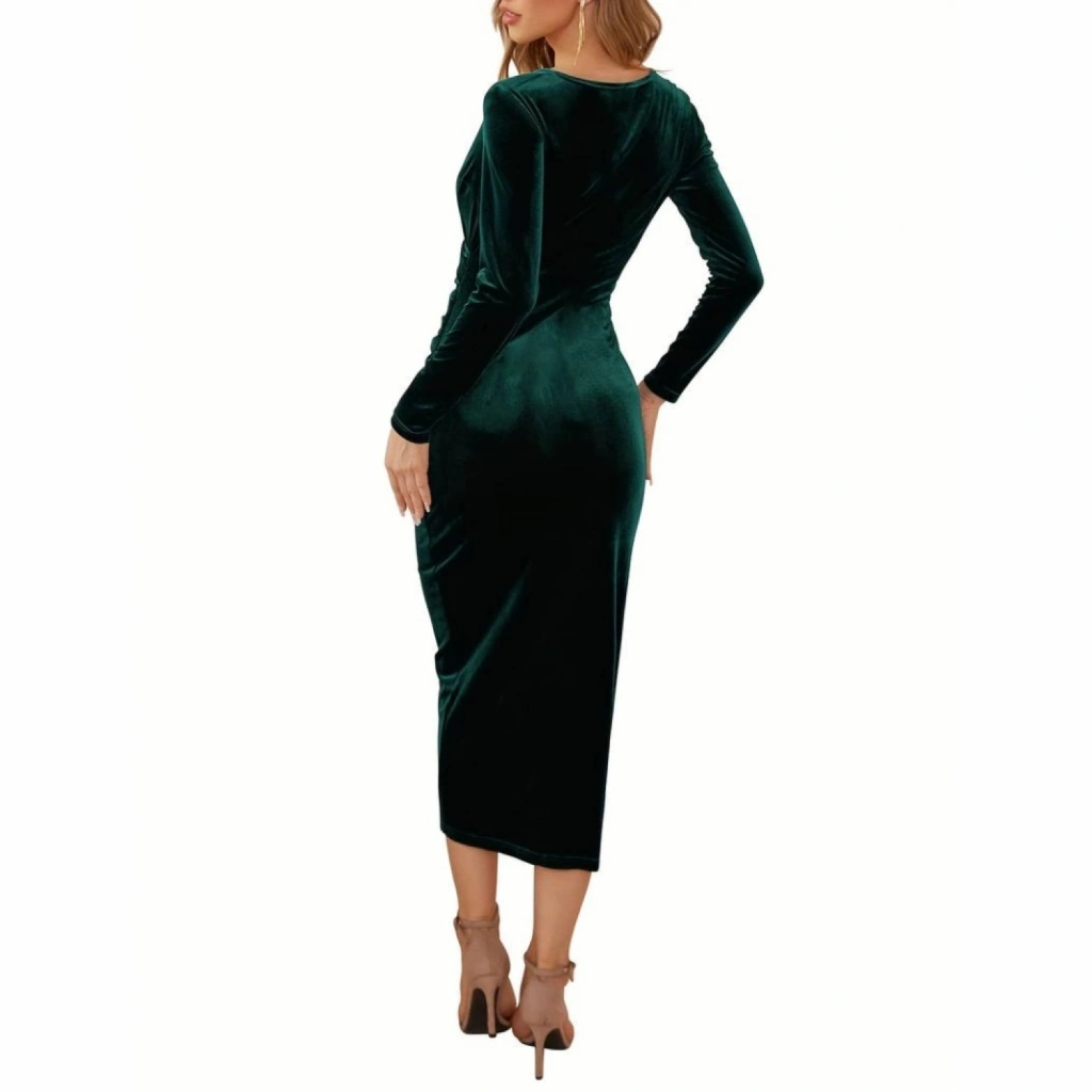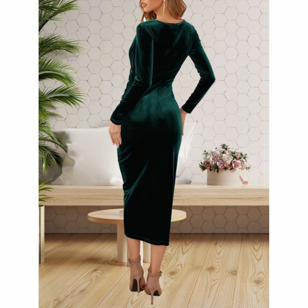 Kadın Uzun Kollu Kruvaze Yaka Belden Büzgü Detay Midi Kadife Elbise