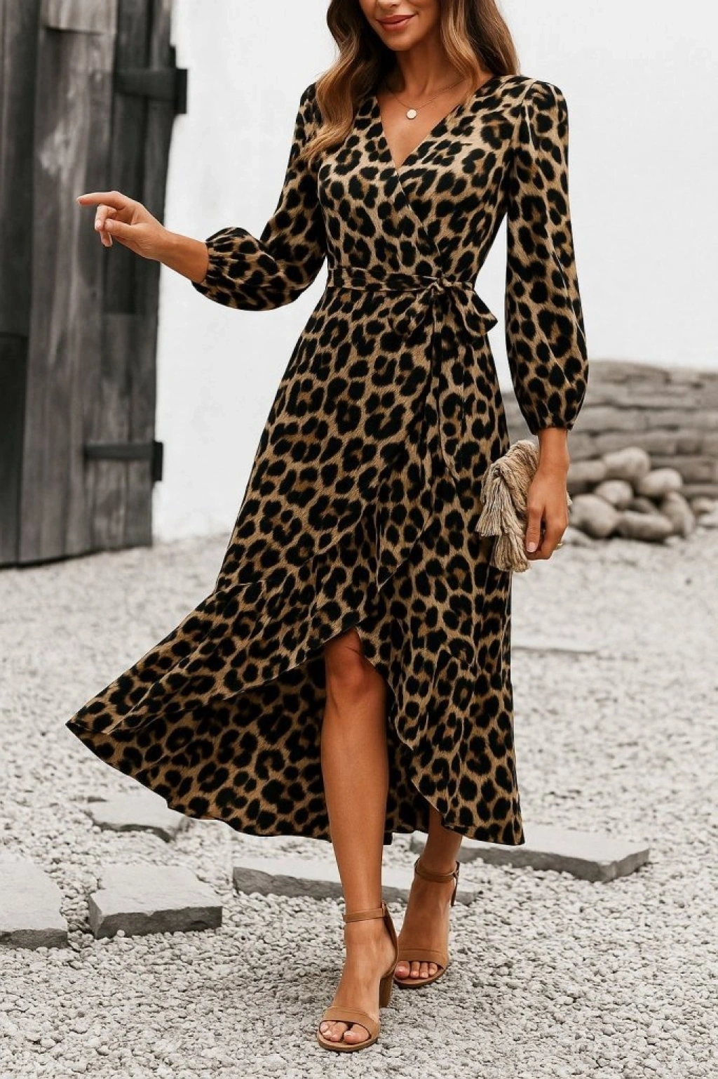 Kadın Uzun Kollu Kruvaze Yaka Yandan Bağlamalı önden Fırfır Detaylı Süprem Uzun Elbise