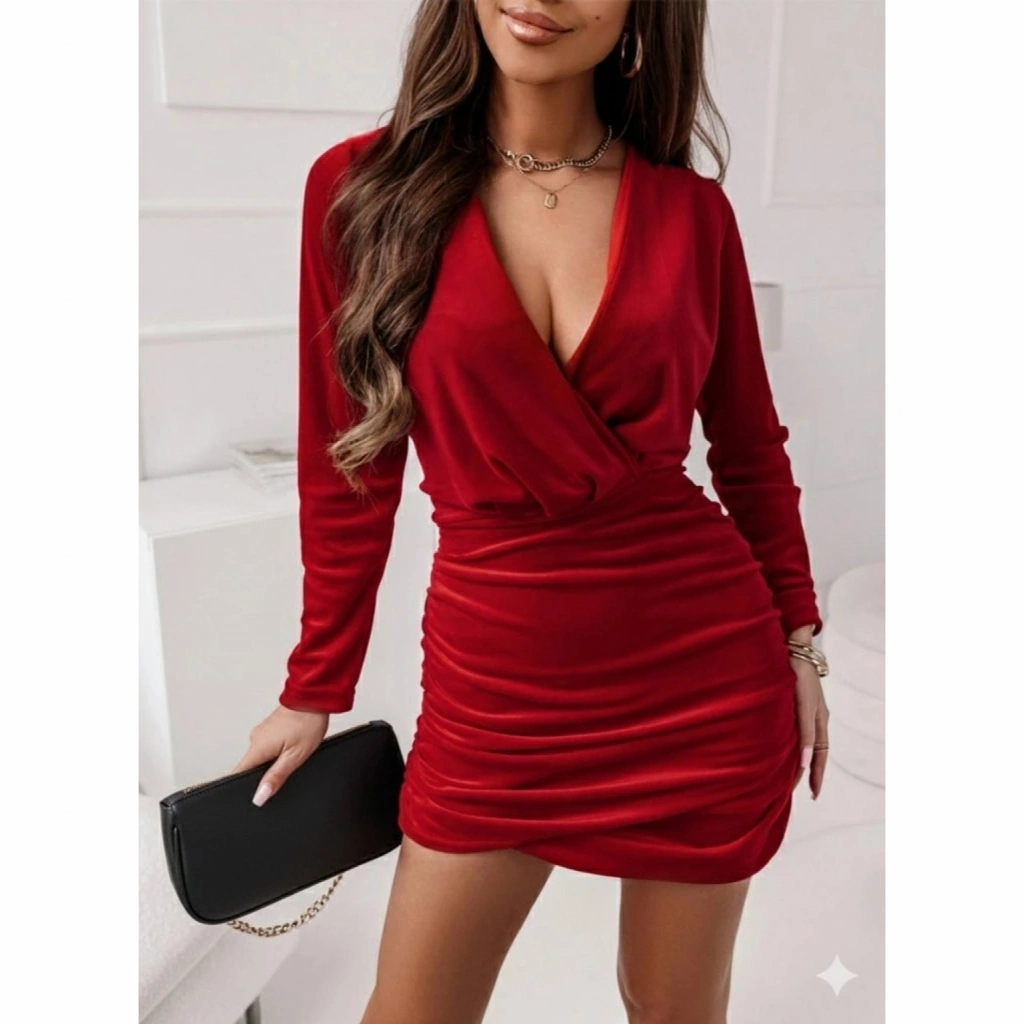 Kadın Uzun Kollu Kruvaze Yaka Yandan Büzgülü Mini Ithal Krep Elbise