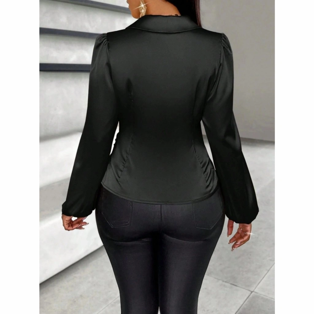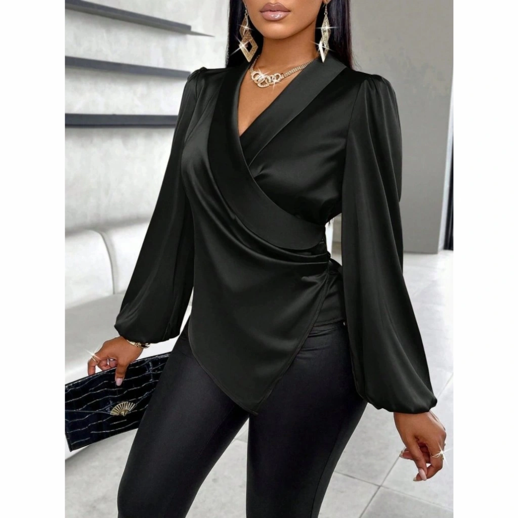 Kadın Uzun Kollu Kruvaze Yakalı Asimetrik Saten Bluz