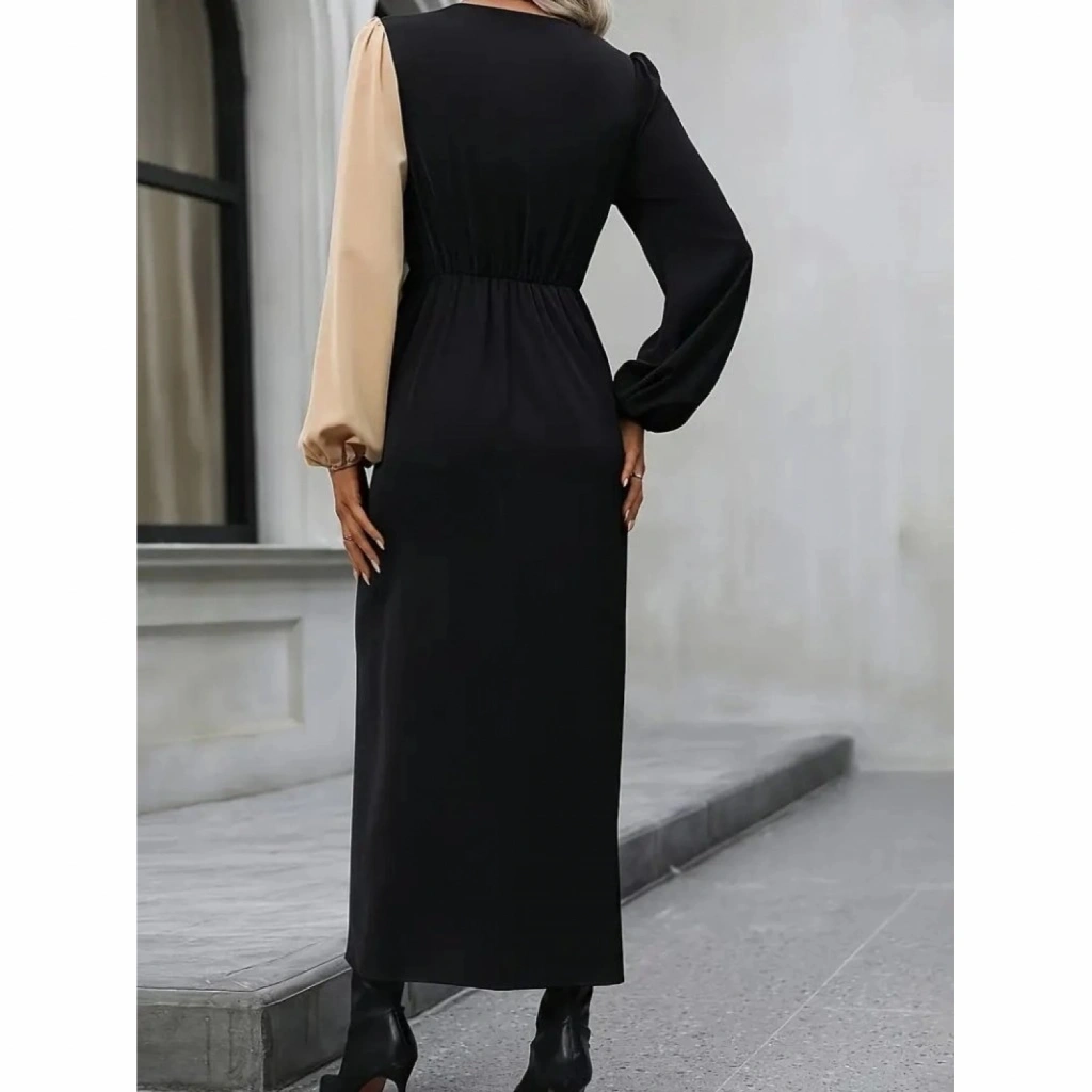 Kadın Uzun Kollu Kruvaze Yakalı Belden çapraz Detaylı çift Renkli Midi Ithal Krep Elbise