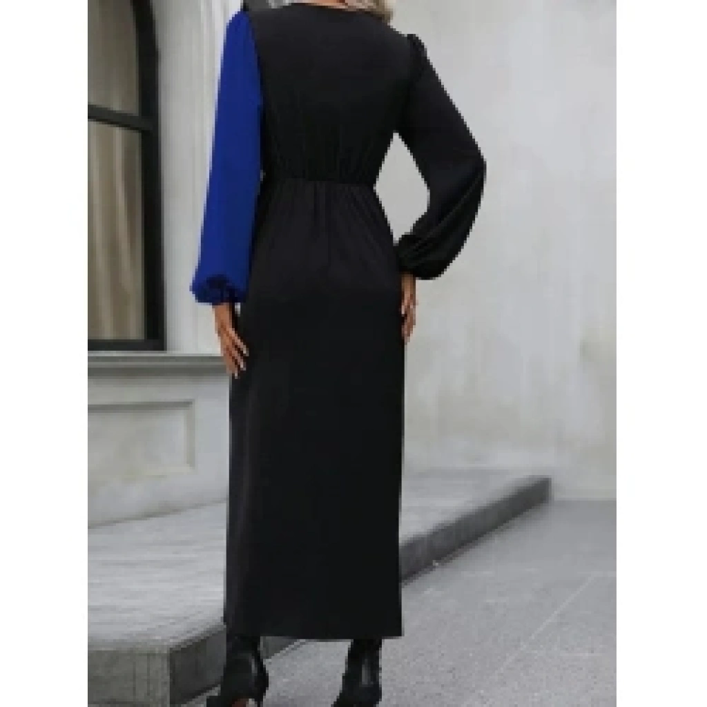 Kadın Uzun Kollu Kruvaze Yakalı Belden çapraz Detaylı çift Renkli Midi Ithal Krep Elbise