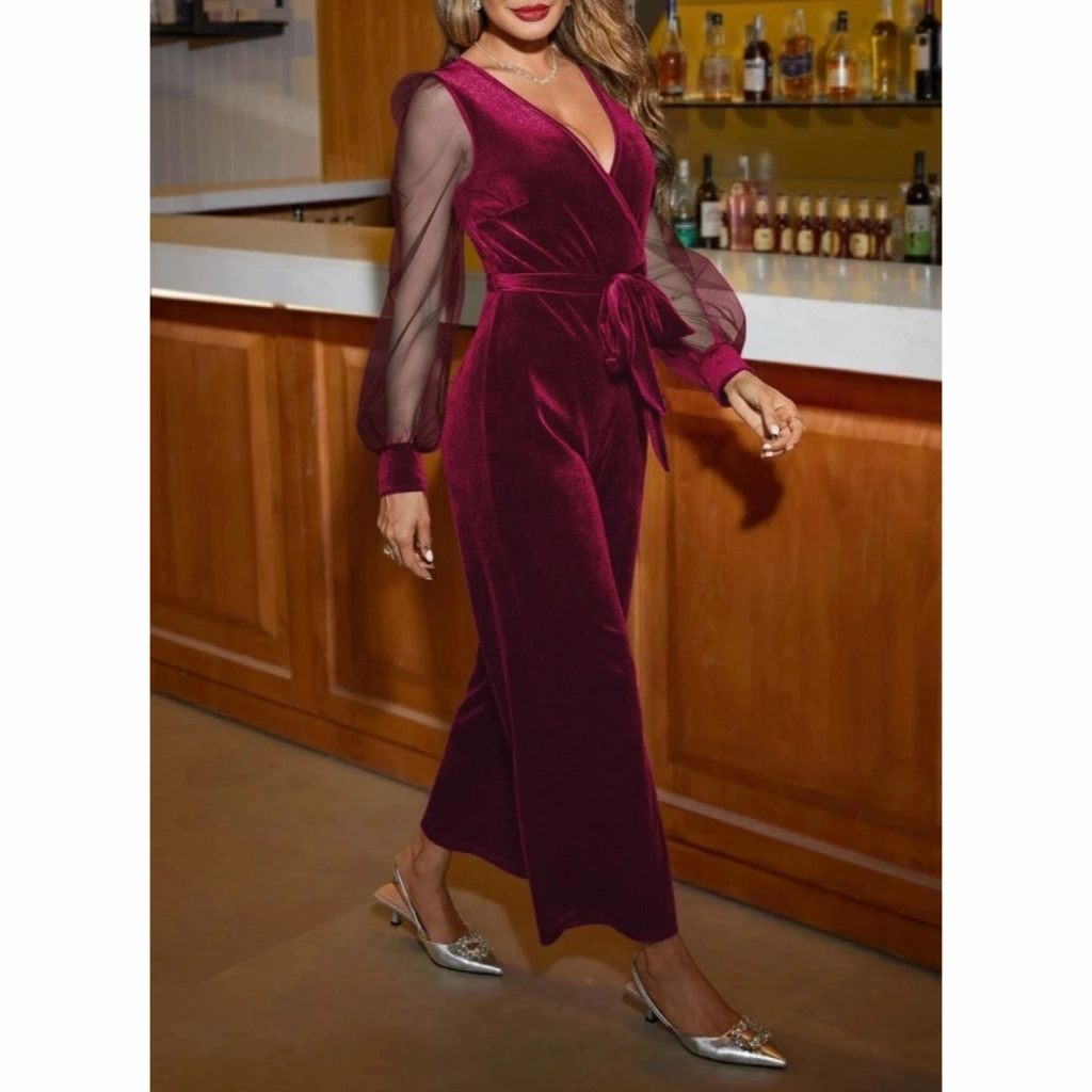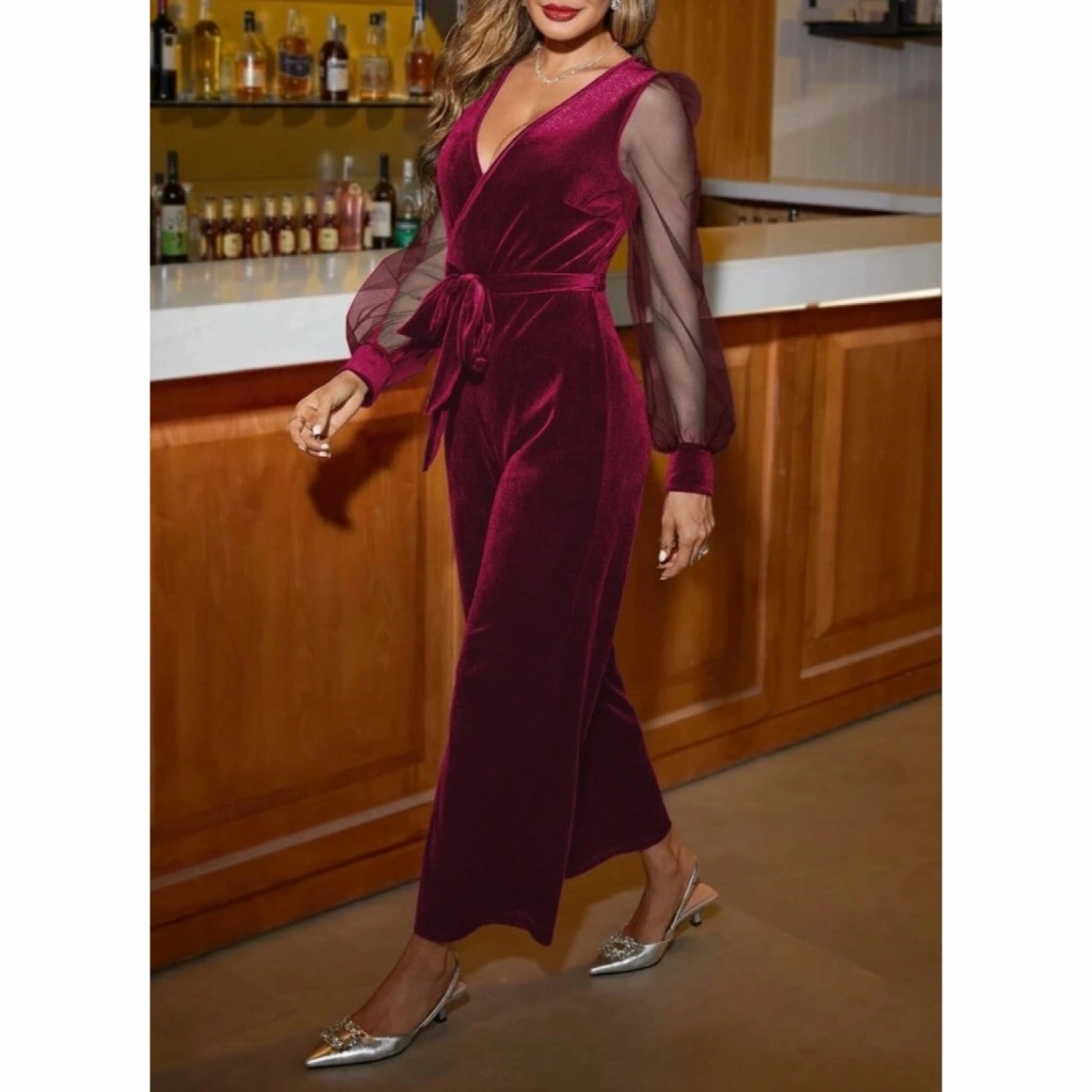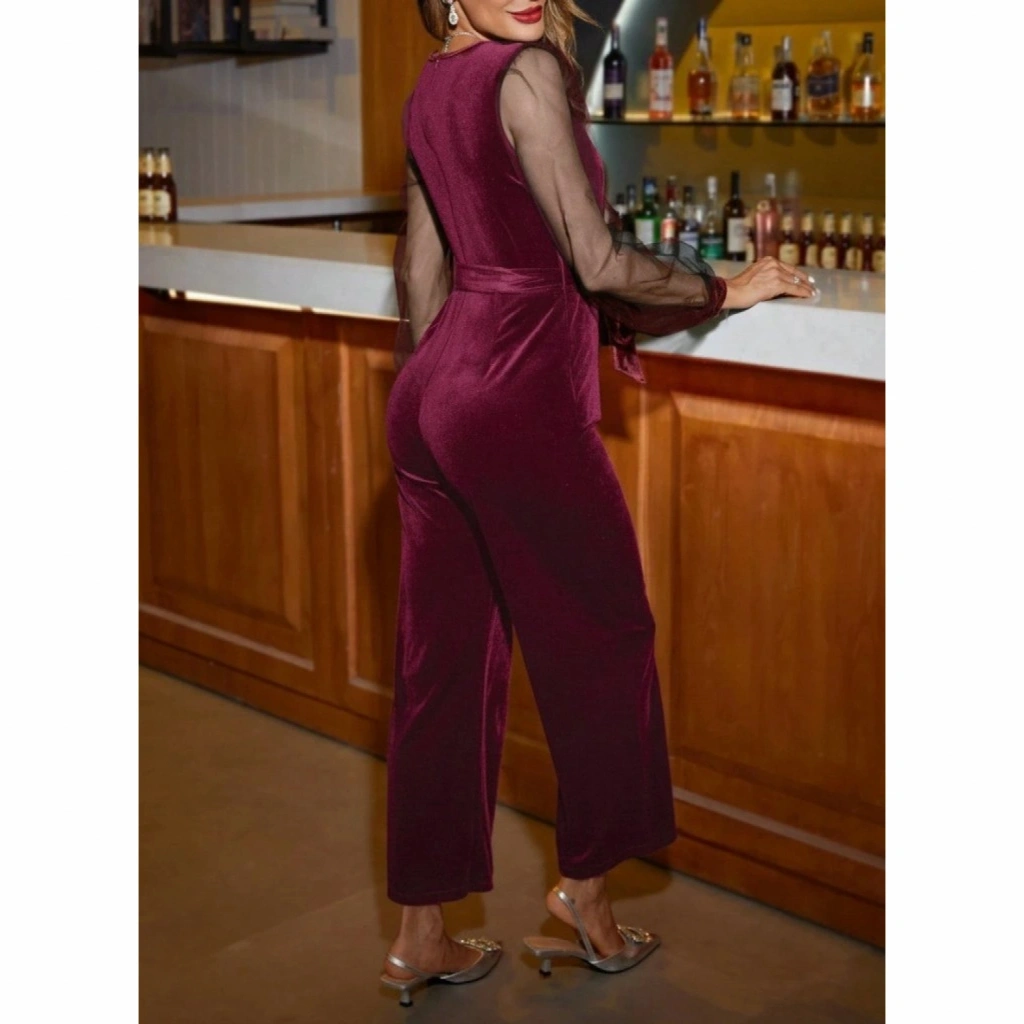 Kadın Uzun Kollu Kruvaze Yakalı Belden Kuşaklı Tül Detaylı Kadife Tulum
