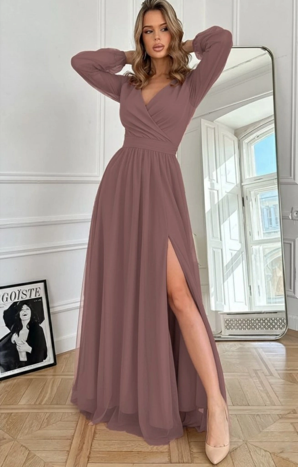 Kadın Uzun Kollu Kruvaze Yakalı Belden Kuşaklı Tüllü Uzun Ithal Krep Elbise
