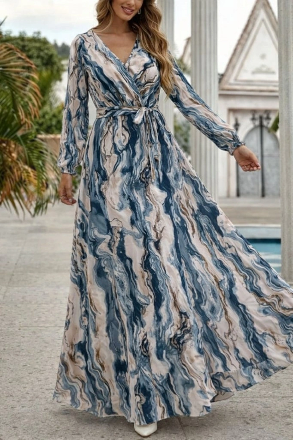 Kadın Uzun Kollu Kruvaze Yakalı Beli Kuşaklı Desenli Süprem Maxi Elbise