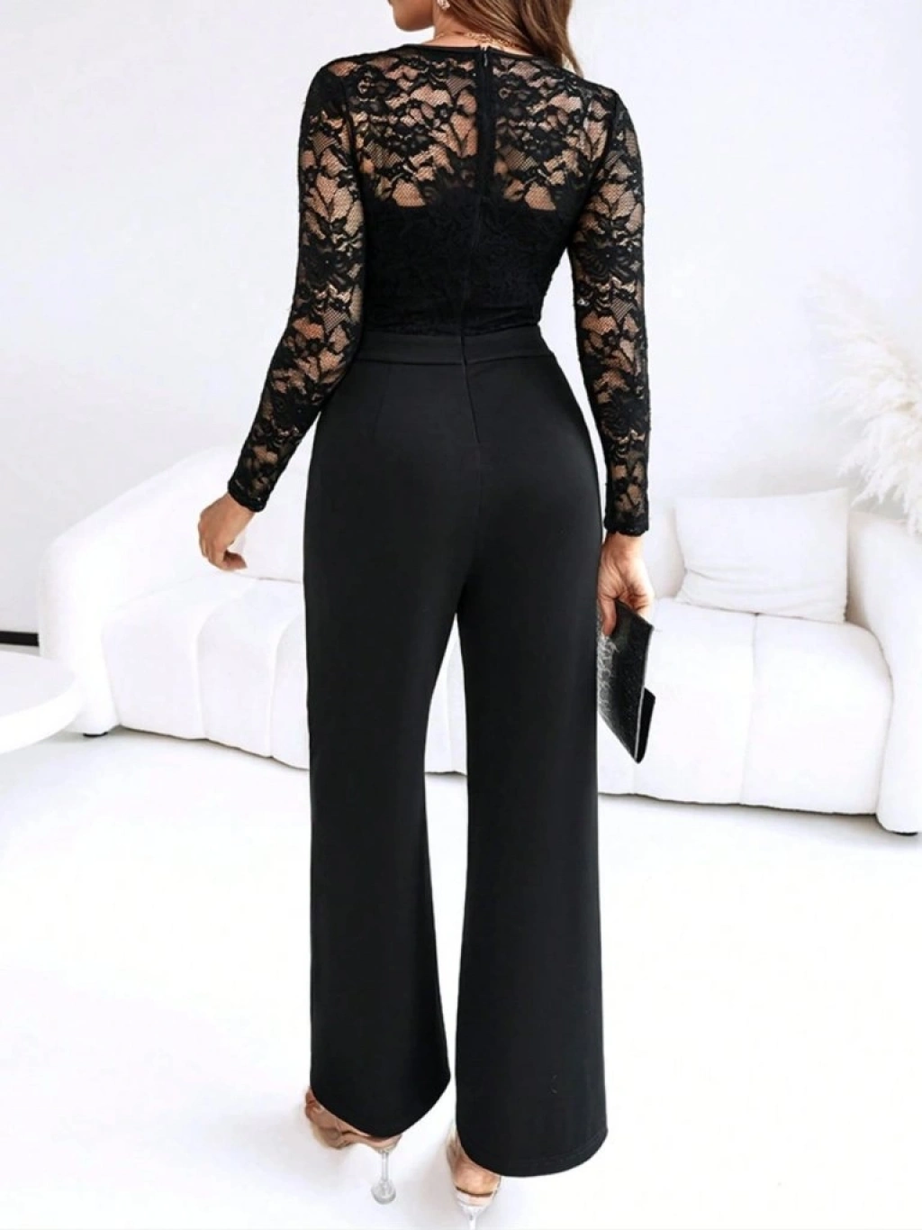Kadın Uzun Kollu Kruvaze Yakalı Dantelli önünde Toka Detaylı Uzun Ithal Krep Tulum