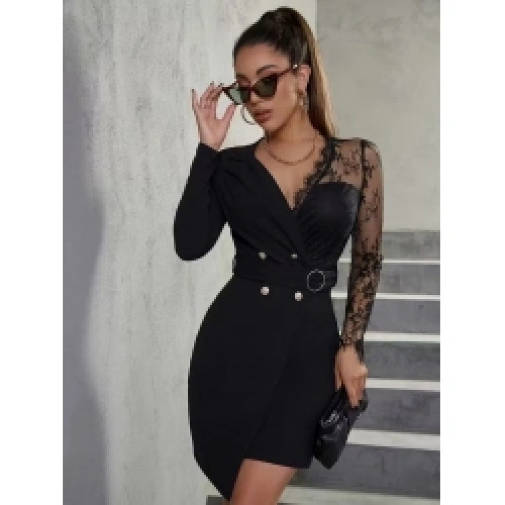 Kadın Uzun Kollu Kruvaze Yakalı önden Düğmeli Kısa Ithal Krep Elbise