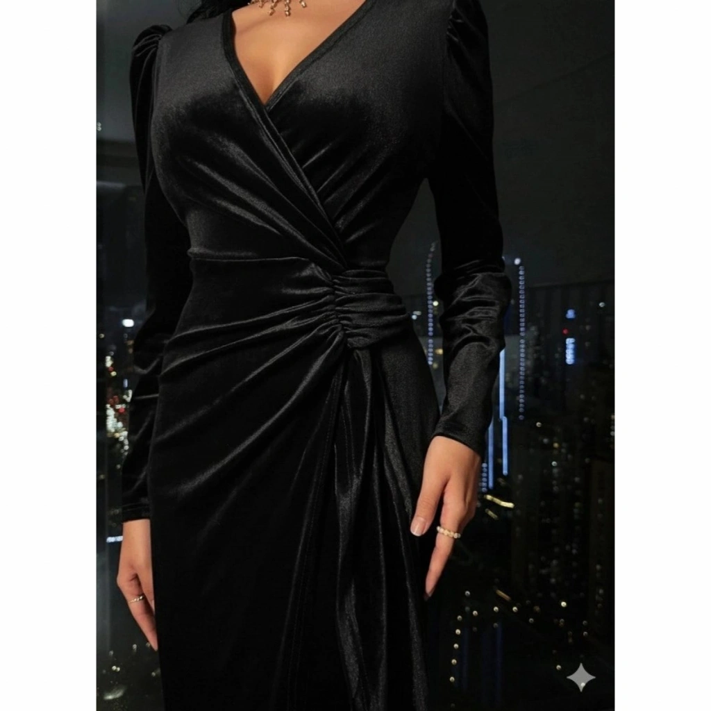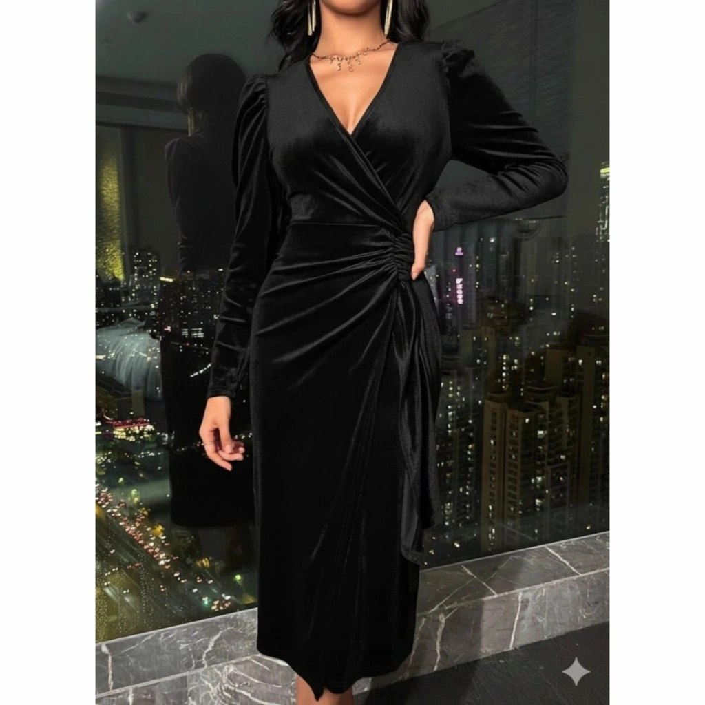 Kadın Uzun Kollu Kruvaze Yakalı Yandan Büzgülü Midi Kadife Elbise