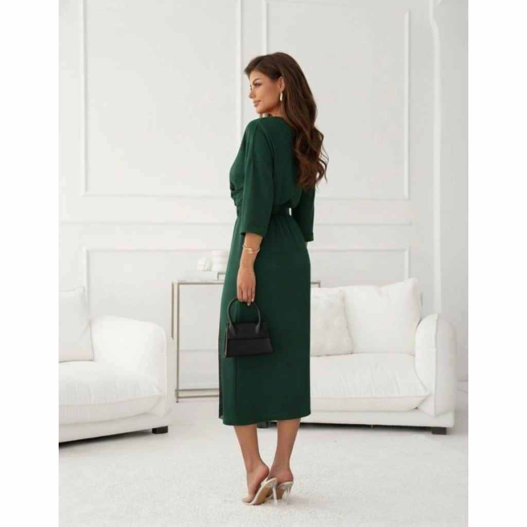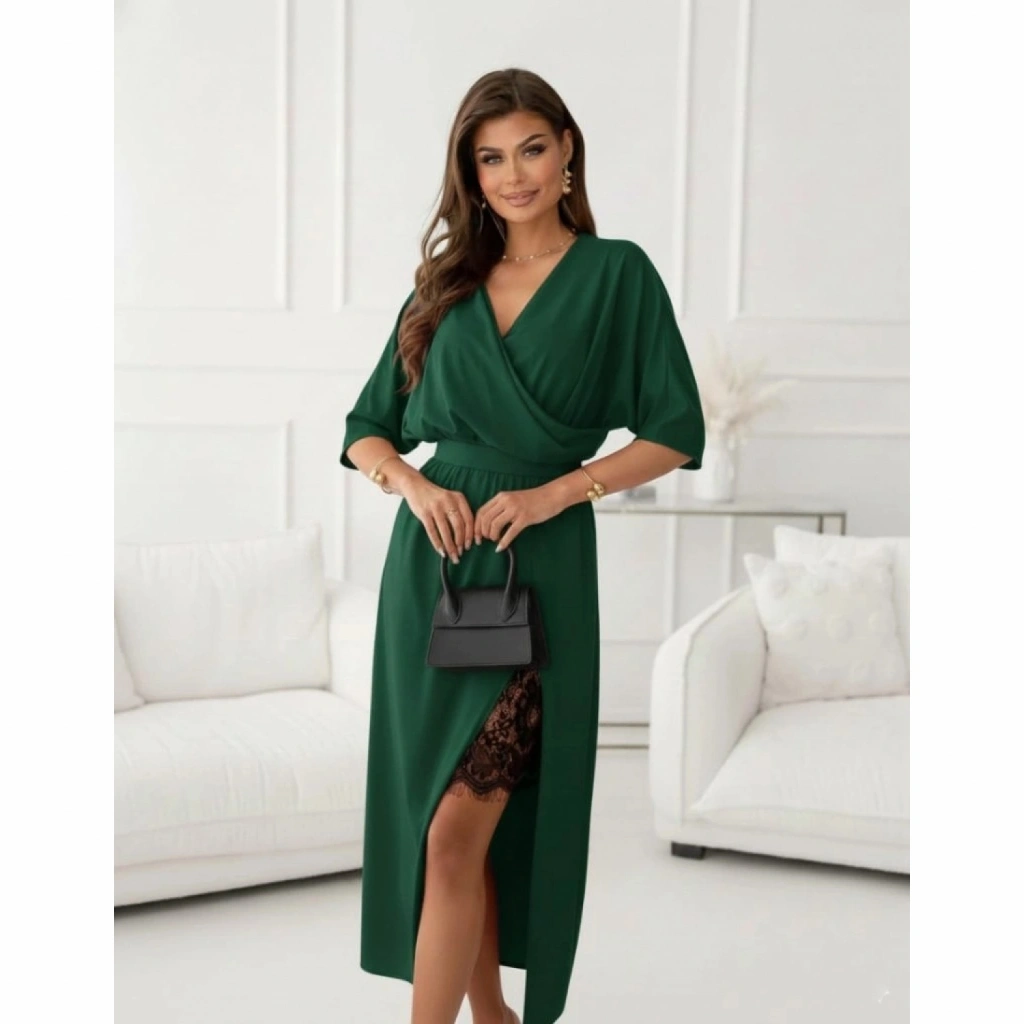 Kadın Uzun Kollu Kruvaze Yakalı Yandan Dantelli Midi Ithal Krep Elbise