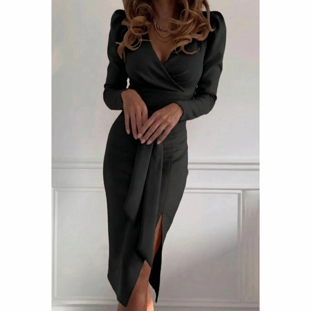 Kadın Uzun Kollu Kruvaze Yakalı Yandan Yırtmaçlı Belden Kuşaklı Midi Ithal Krep Elbise