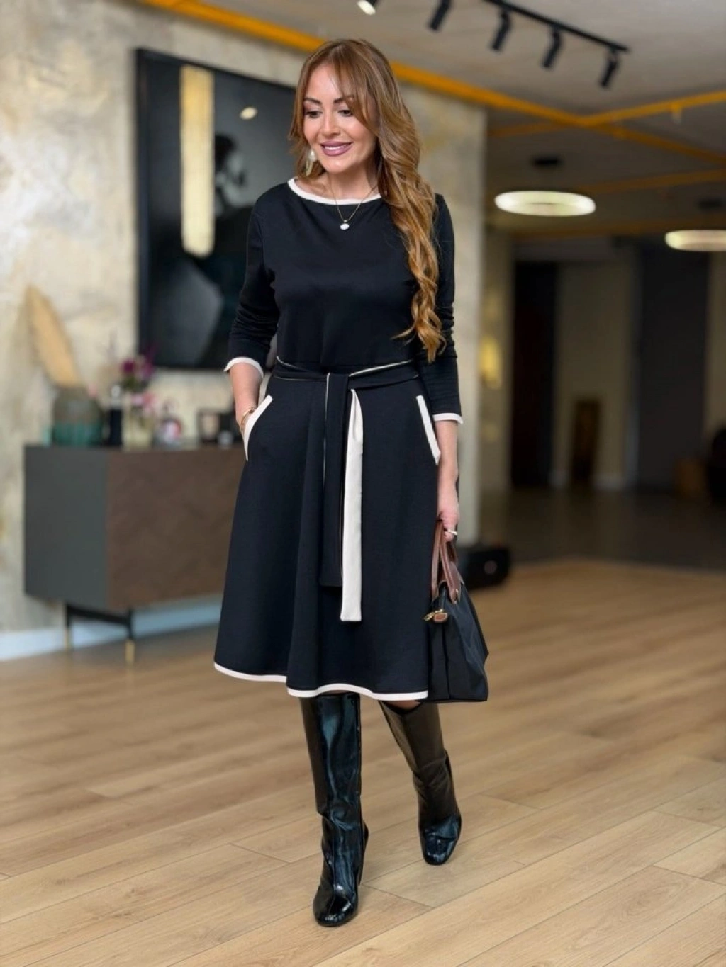 Kadın Uzun Kollu Kuşak Dahil Midi Boy Lbise
