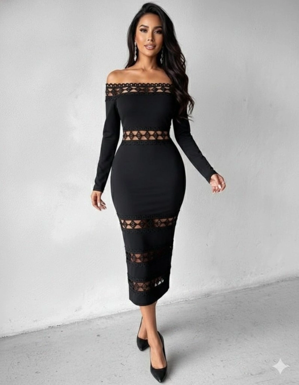 Kadın Uzun Kollu Madonna Dantel Yaka Yırtmaçlı Midi Dalgıç Elbise