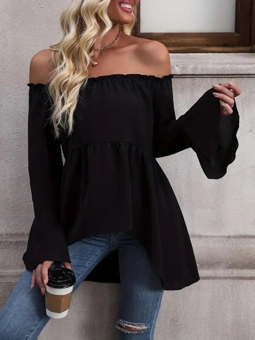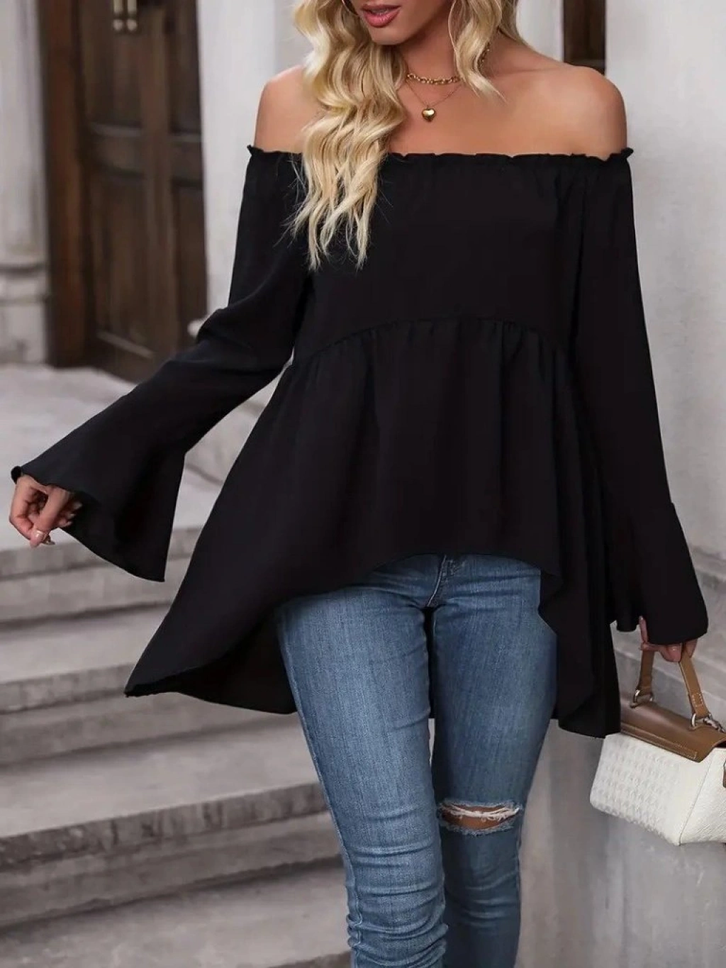 Kadın Uzun Kollu Madonna Yaka Asimetrik Detaylı Kolları Ispanyol Viskon Bluz