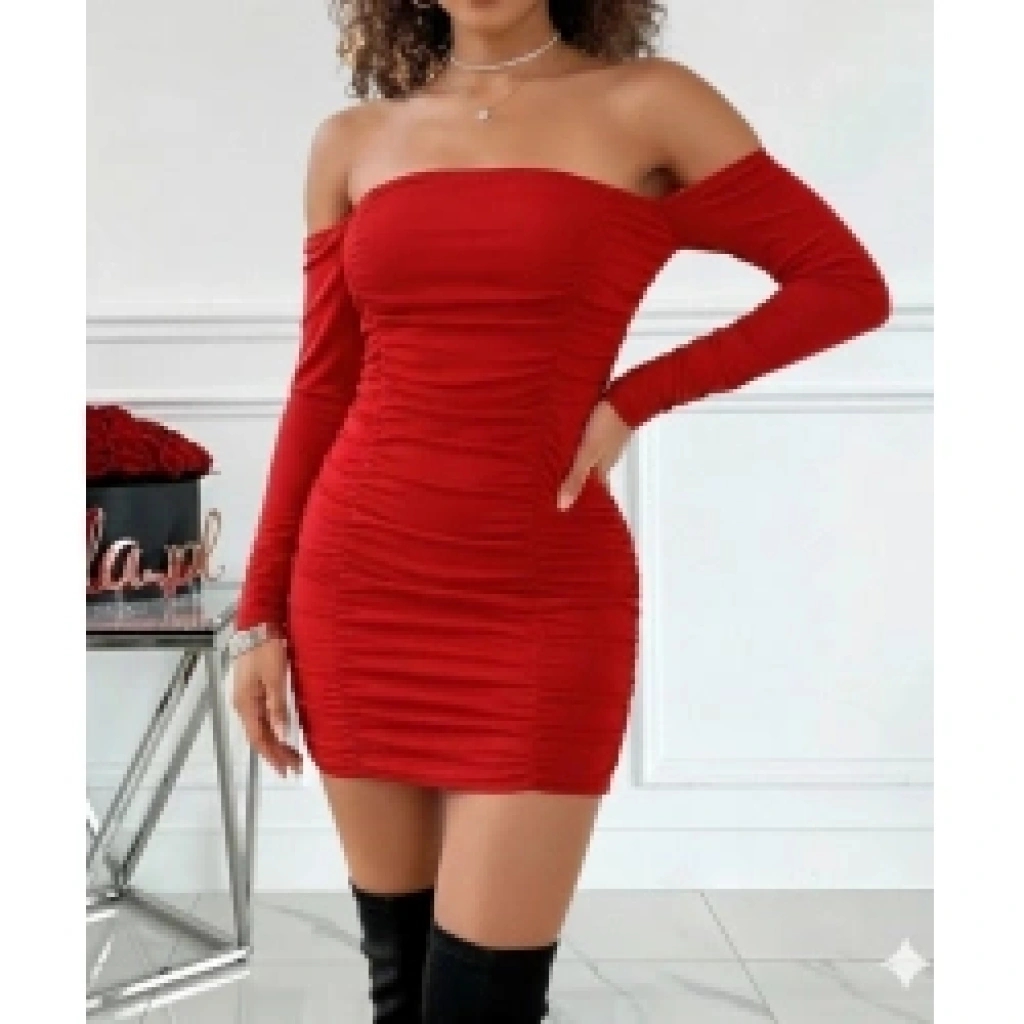 Kadın Uzun Kollu Omuzlardan Açık Takma Kollu Büzgülü Sandy Kısa Elbise