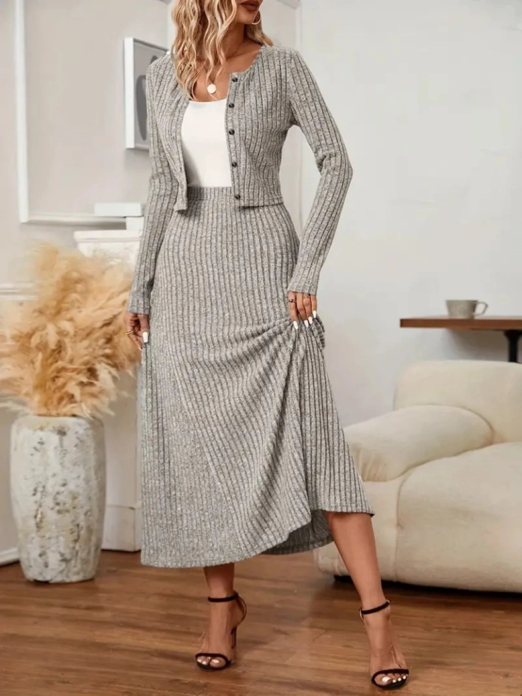 Kadın Uzun Kollu önden Düğmeli Bluz Ve Yüksek Bel A Kesim Uzun Etek şardonlu Kaşkorse Ikili Takım