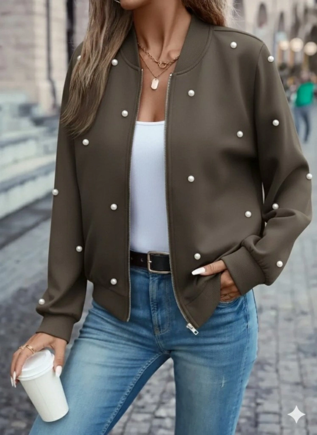Kadın Uzun Kollu önden Fermuarlı Incili Kısa Modal Ceket