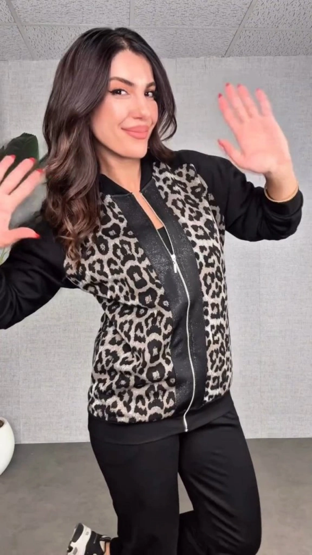 Kadın Uzun Kollu önden Fermuarlı Leopar Desenli Viskon Iki Iplik Bluz Ve Pantolon Ikili Takım