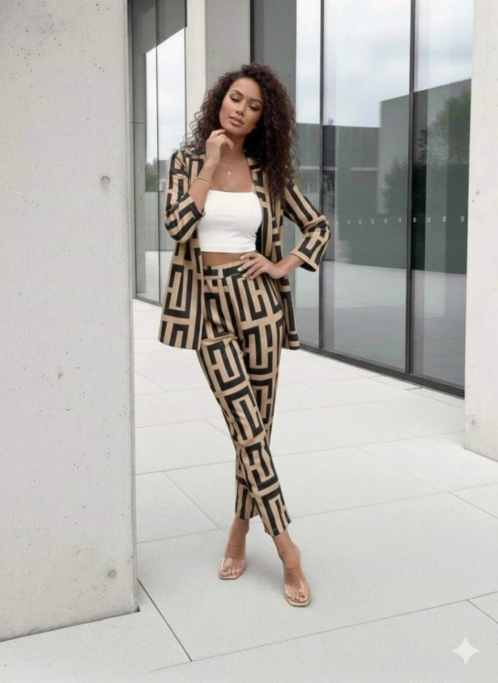 Kadın Uzun Kollu önü Açık Desenli Iki Iplik Ceket Ve Pantolon Ikili Takım