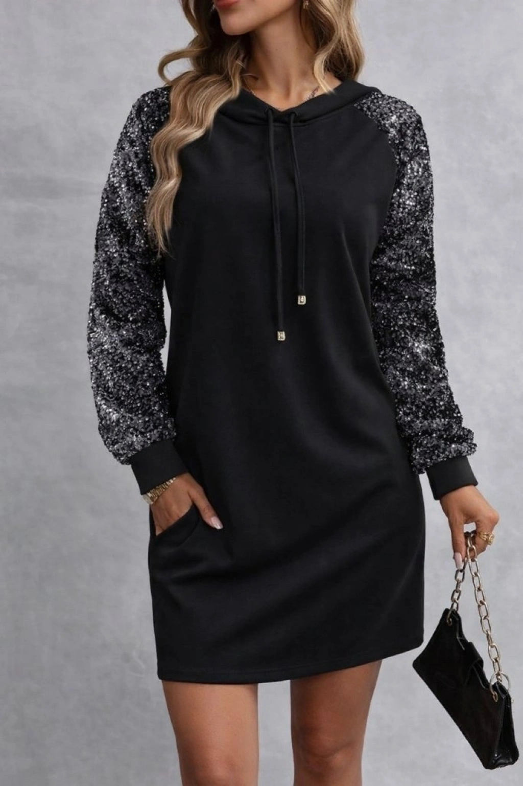 Kadın Uzun Kollu Pulpayetli Bağcıklı Cep Detaylı Mini Viskon Iki Iplik Elbise