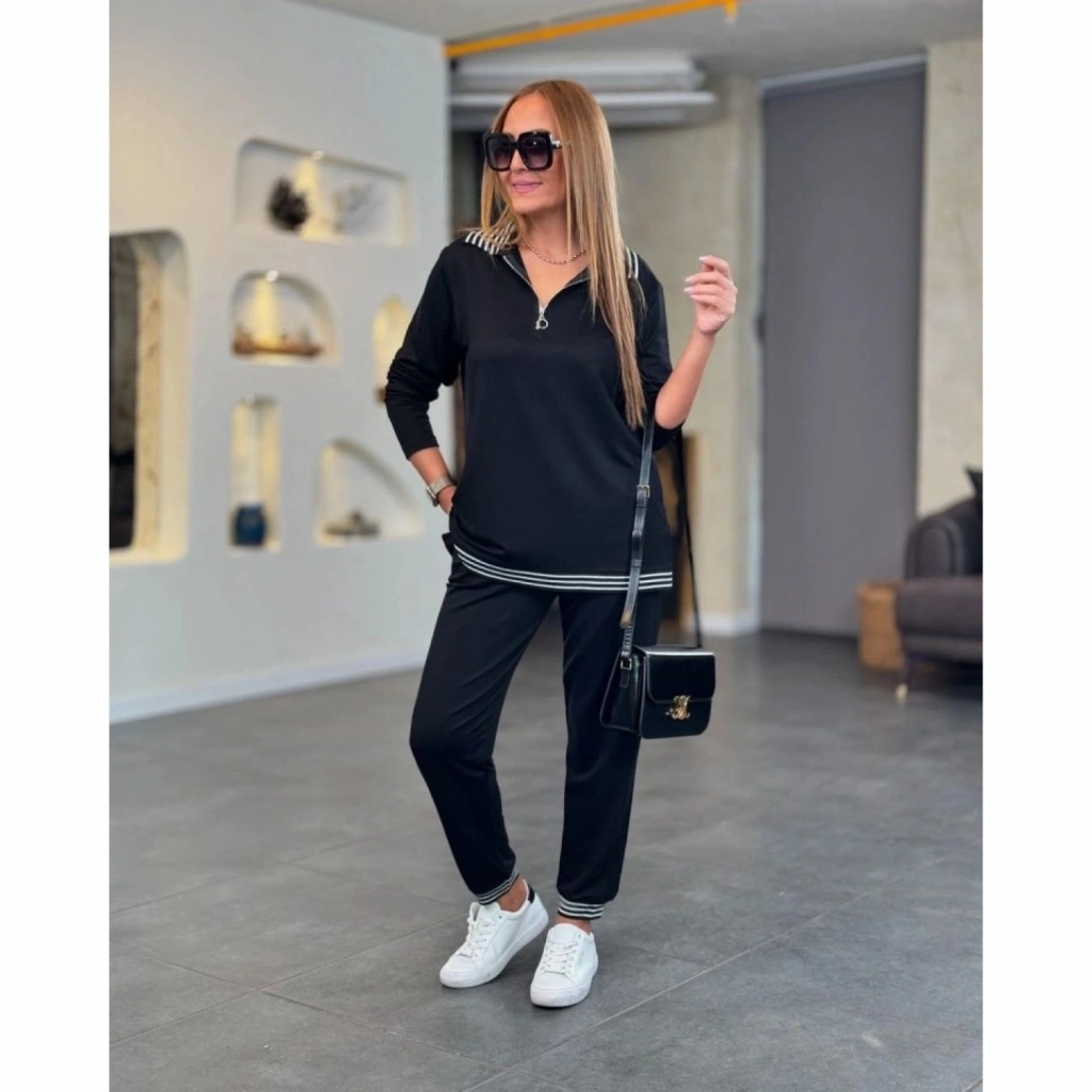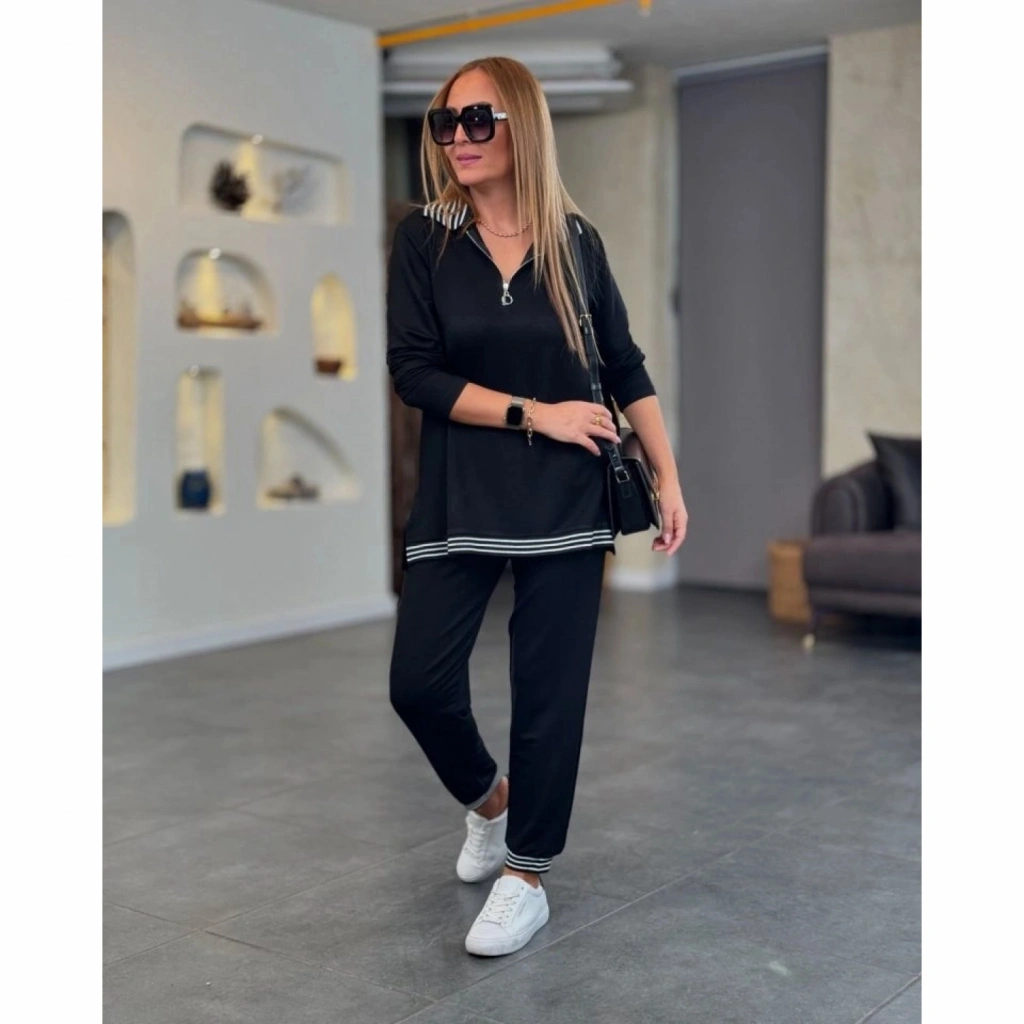 Kadın Uzun Kollu Ribana Ve Fermuar Detay Bluz Ve Yüksel Bel Pantolon 2li Takım