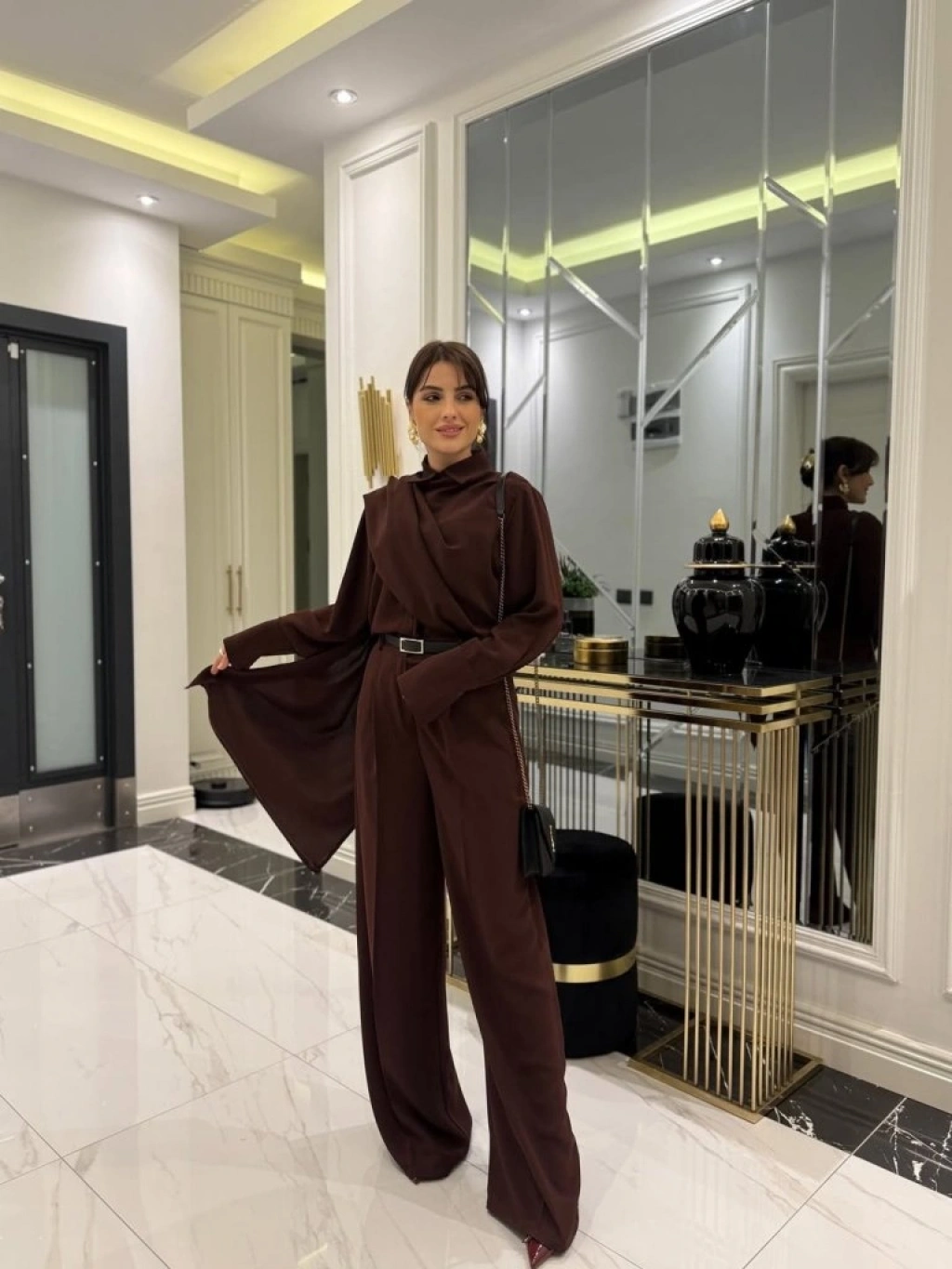 Kadın Uzun Kollu şal Detaylı Bluz Ve Pantolon Kemer Dahil Ikili Takım