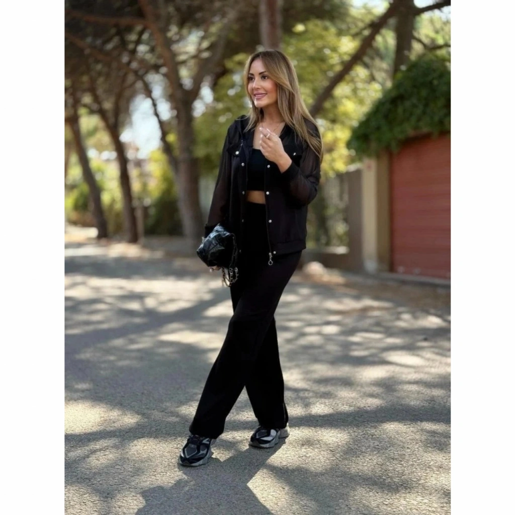 Kadın Uzun Kollu Tül Detaylı önü Düğmeli Viskon Iki Iplik Ceket Ve Pantolon Ikili Takım