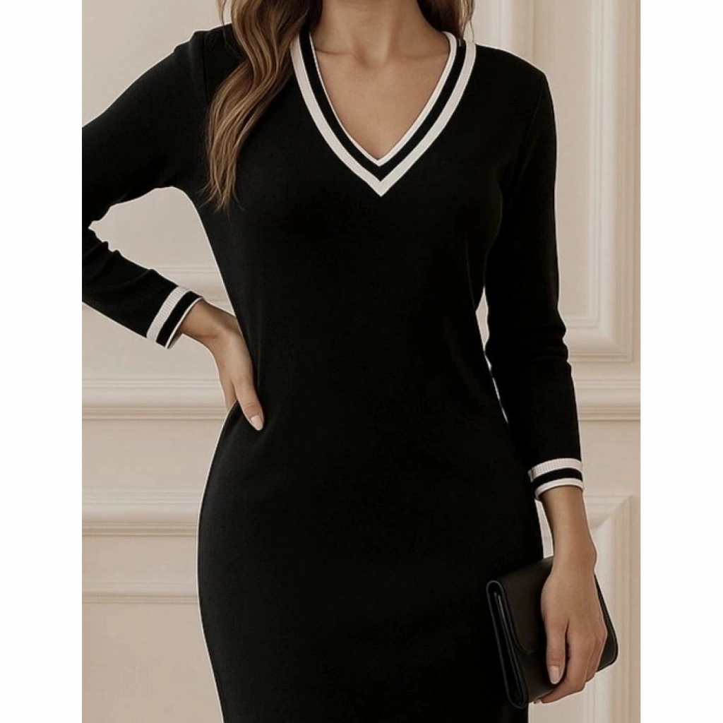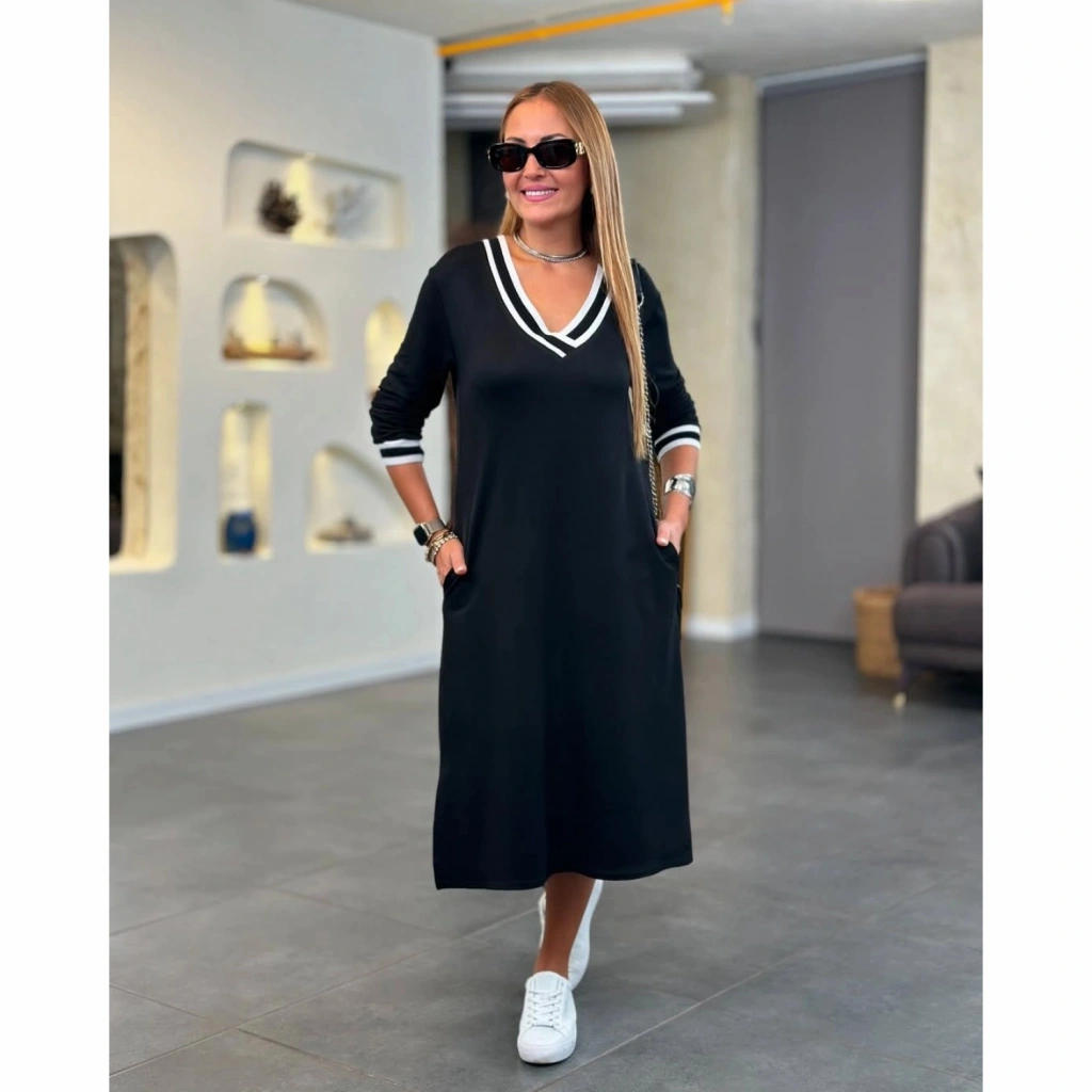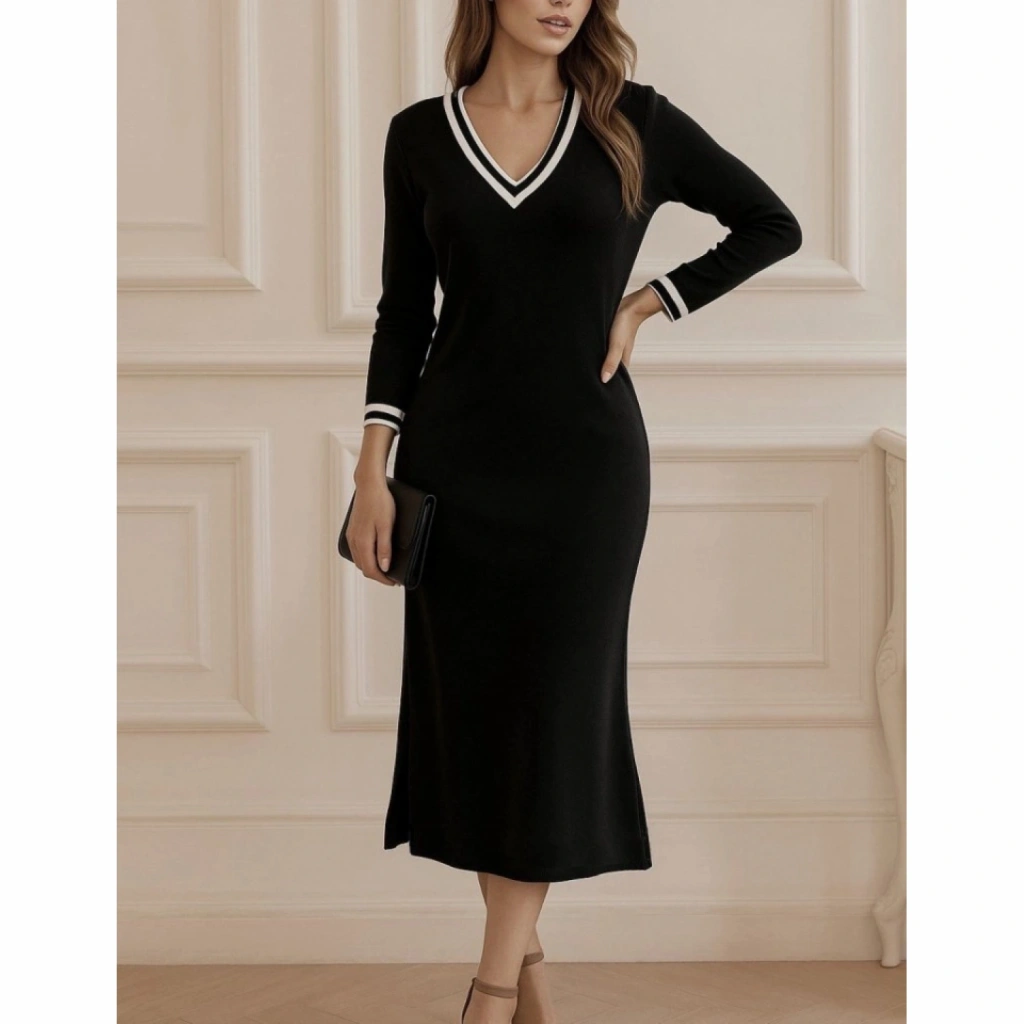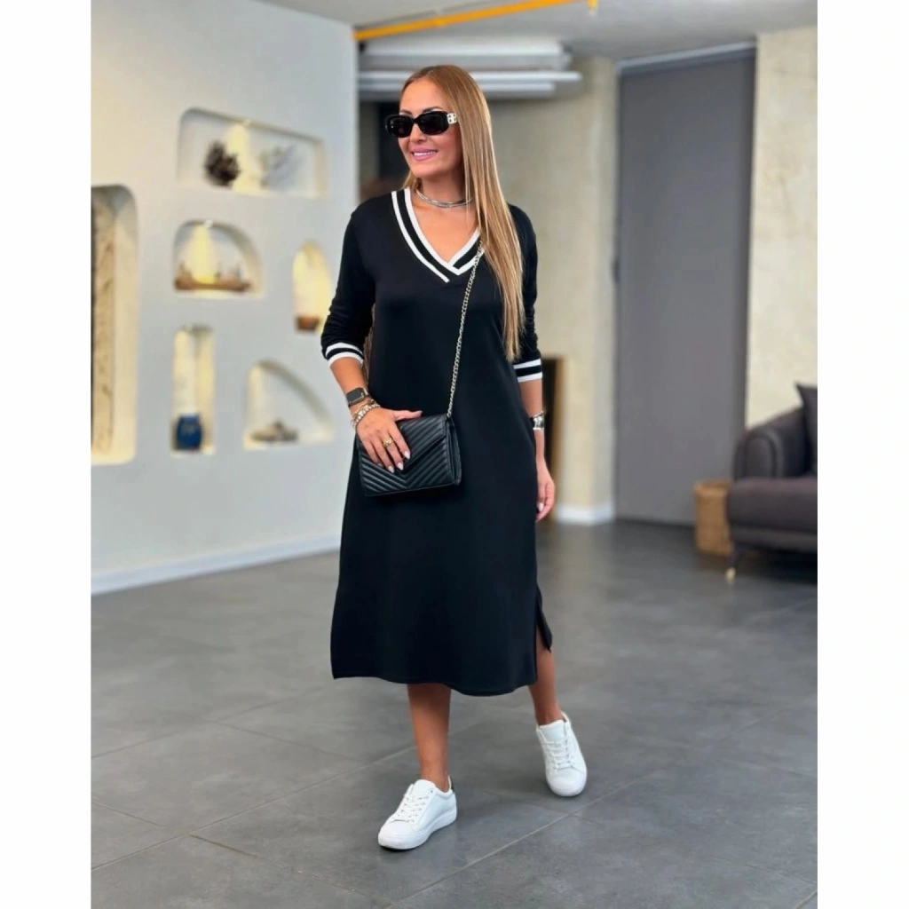 Kadın Uzun Kollu V Ribana Yakalı Yanlardan Yırtmaçlı Midi Viskon Iki Iplik Elbise