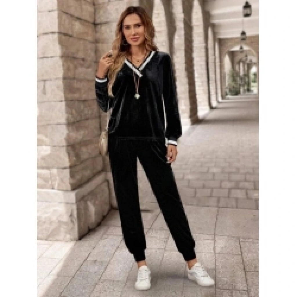 Kadın Uzun Kollu V Yaka Kadife Bluz Ve Pantolon Ikili Takım
