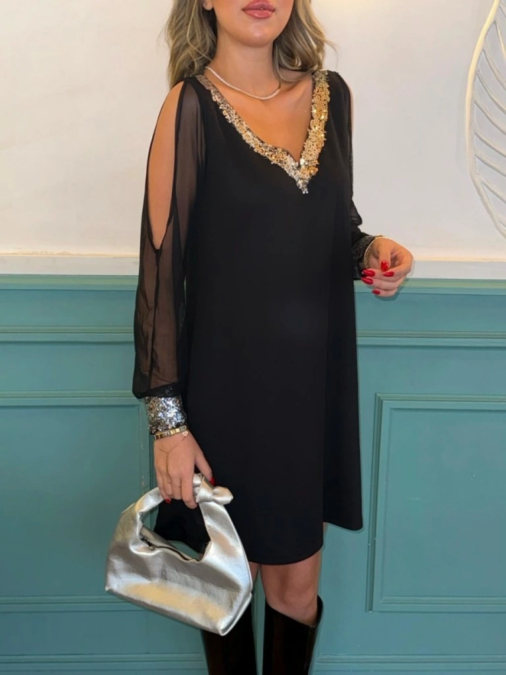 Kadın Uzun Kollu V Yaka Kollar Tül Yırtmaç Detay Kol Manşetleri Ve Yaka Payet Krep Elbise