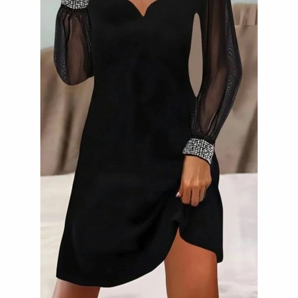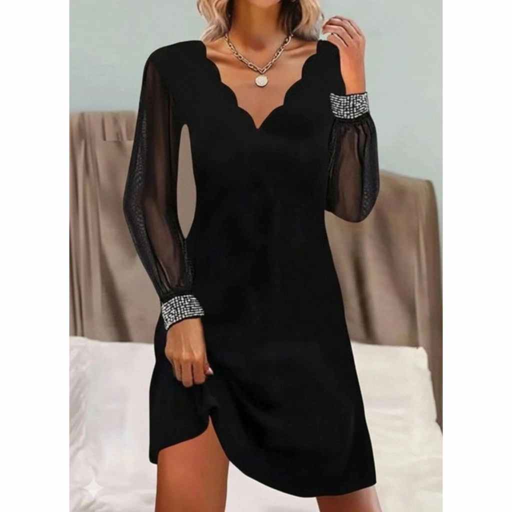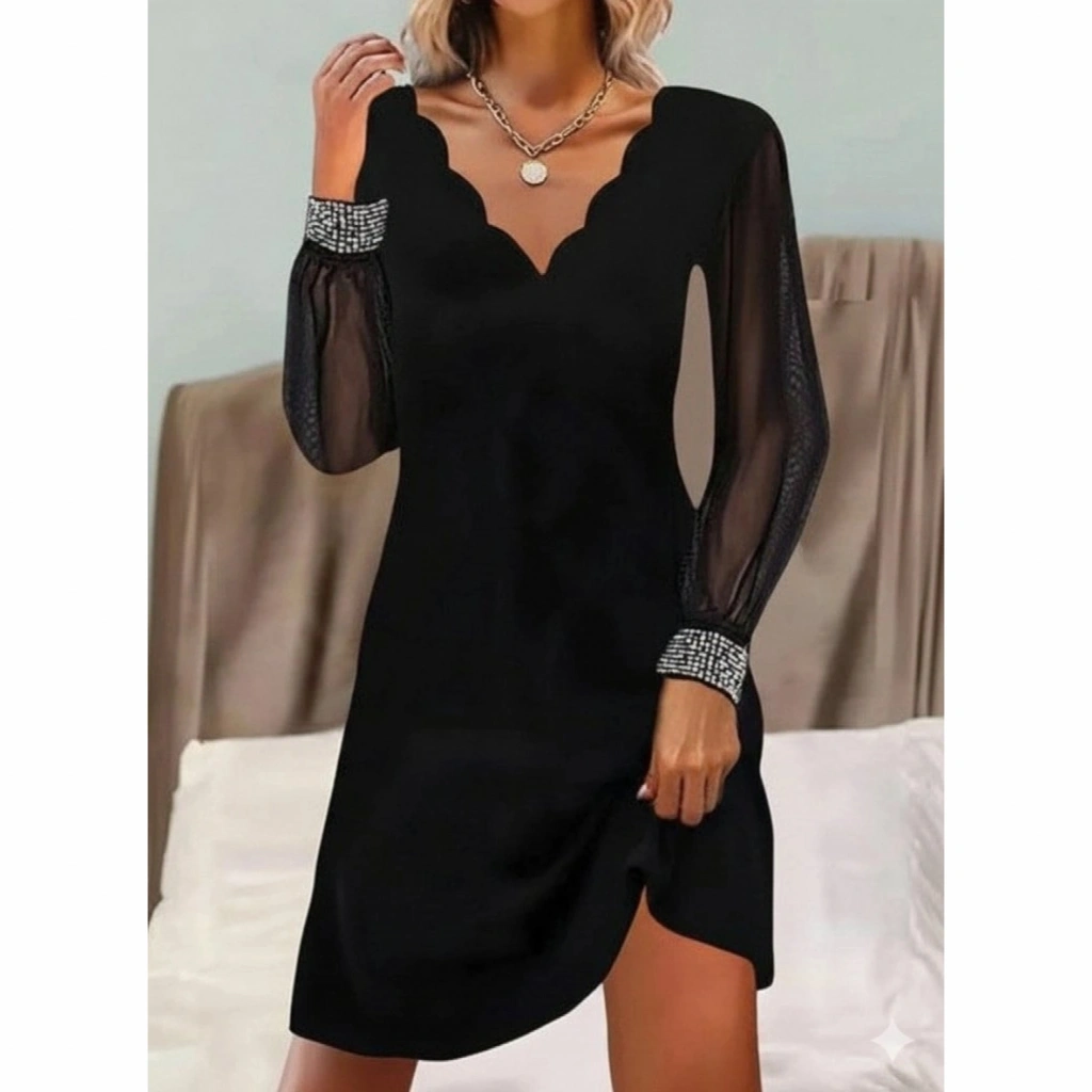 Kadın Uzun Kollu V Yaka Lazer Kesimli Tül Detaylı Mini Ithal Krep Elbise