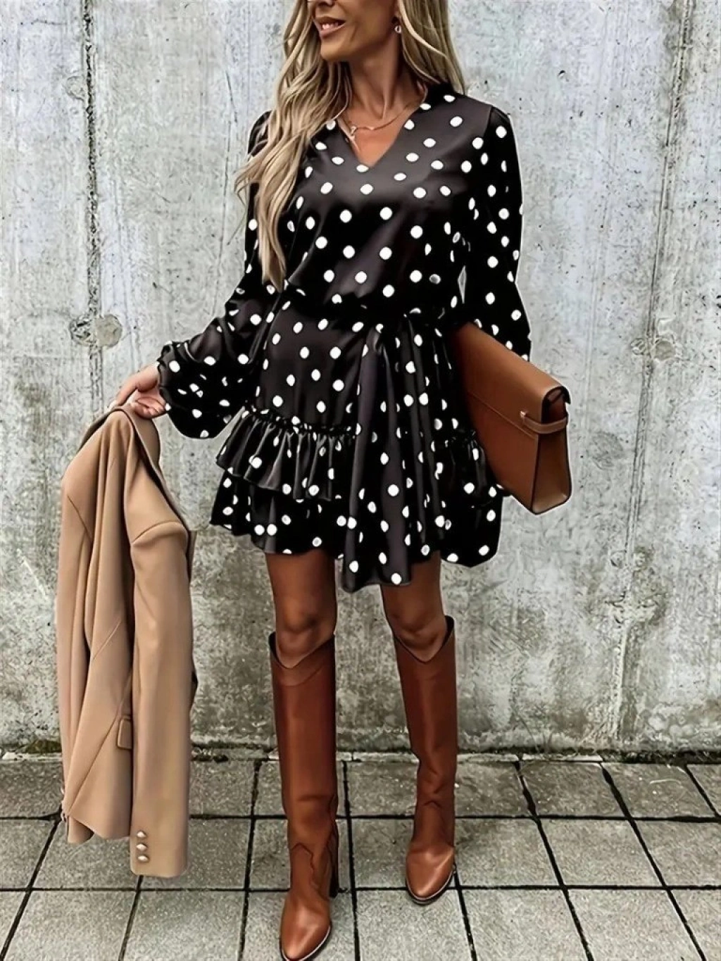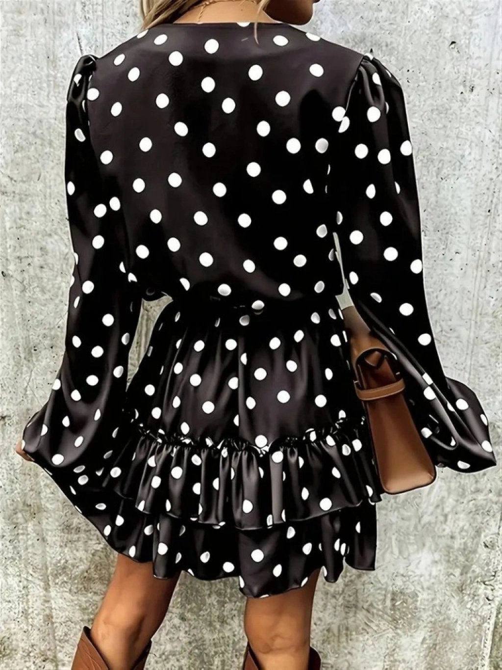 Kadın Uzun Kollu V Yakalı Belden Kuşaklı Puantiyeli Mini Modal Elbise