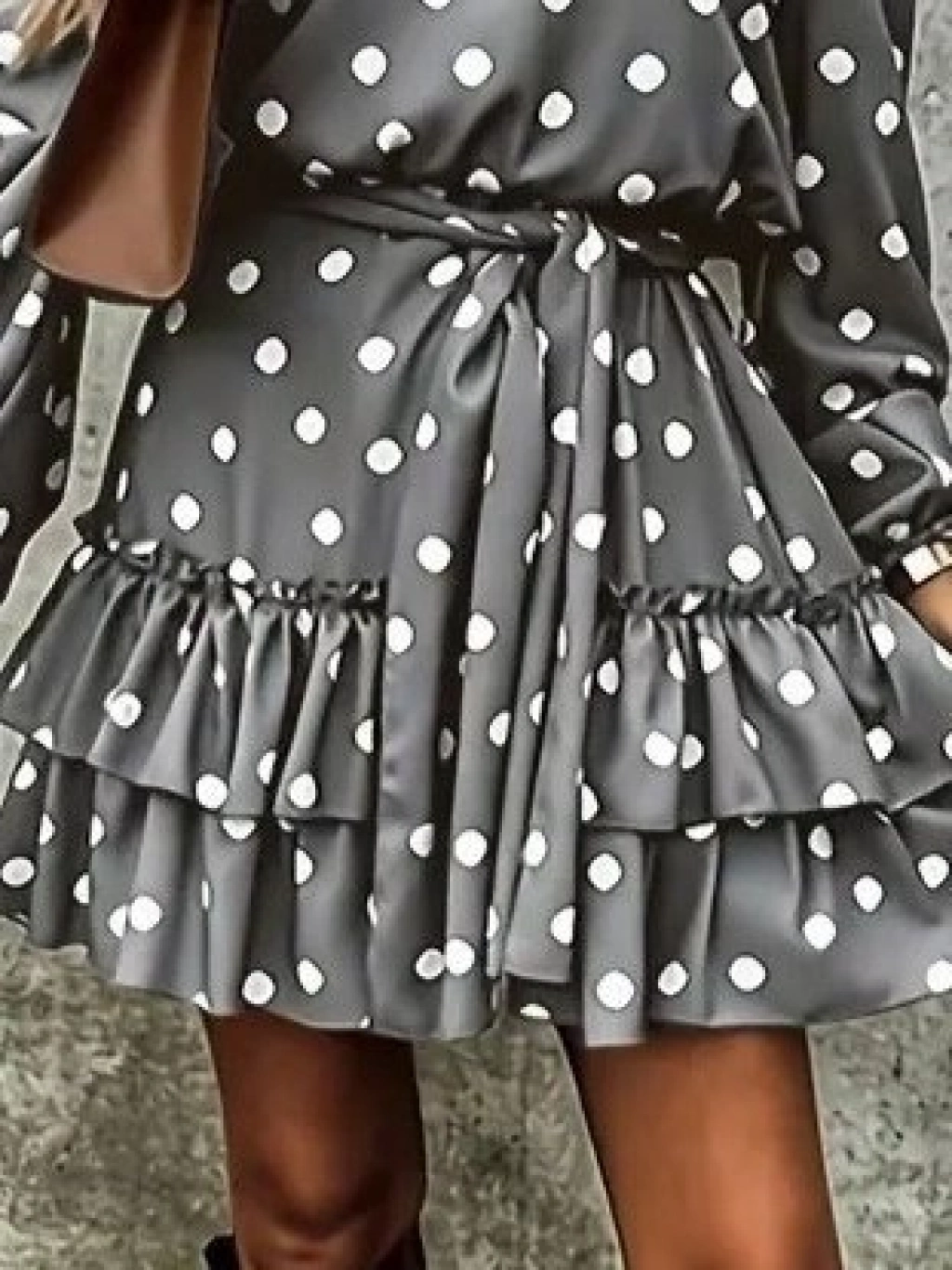 Kadın Uzun Kollu V Yakalı Belden Kuşaklı Puantiyeli Mini Modal Elbise