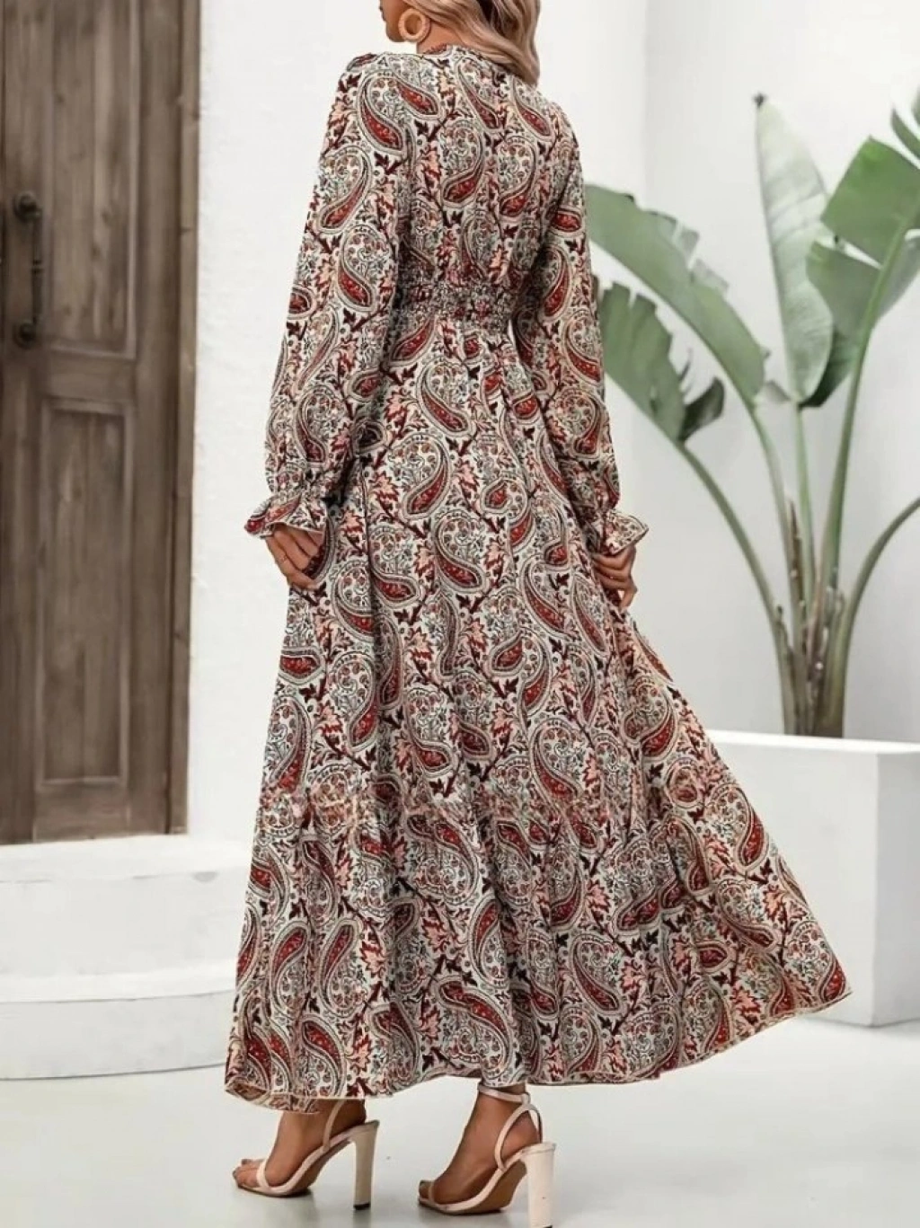 Kadın Uzun Kollu V Yakalı Beli Lastikli Desenli Süprem Elbise