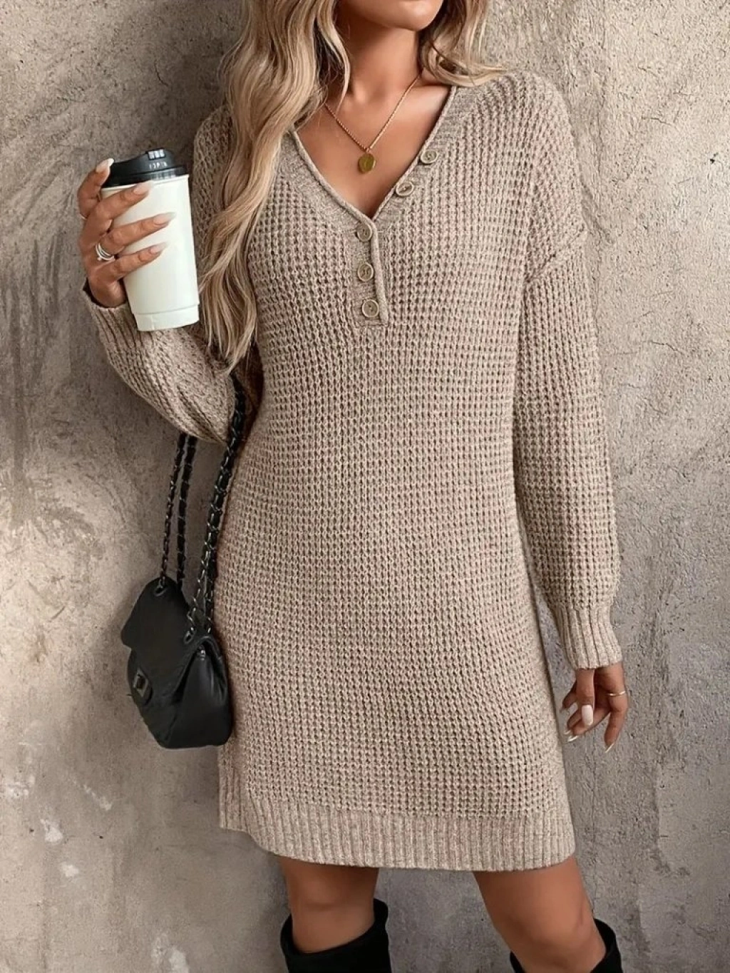Kadın Uzun Kollu V Yakalı Düğmeli Mini Triko Taş Renkli Elbise