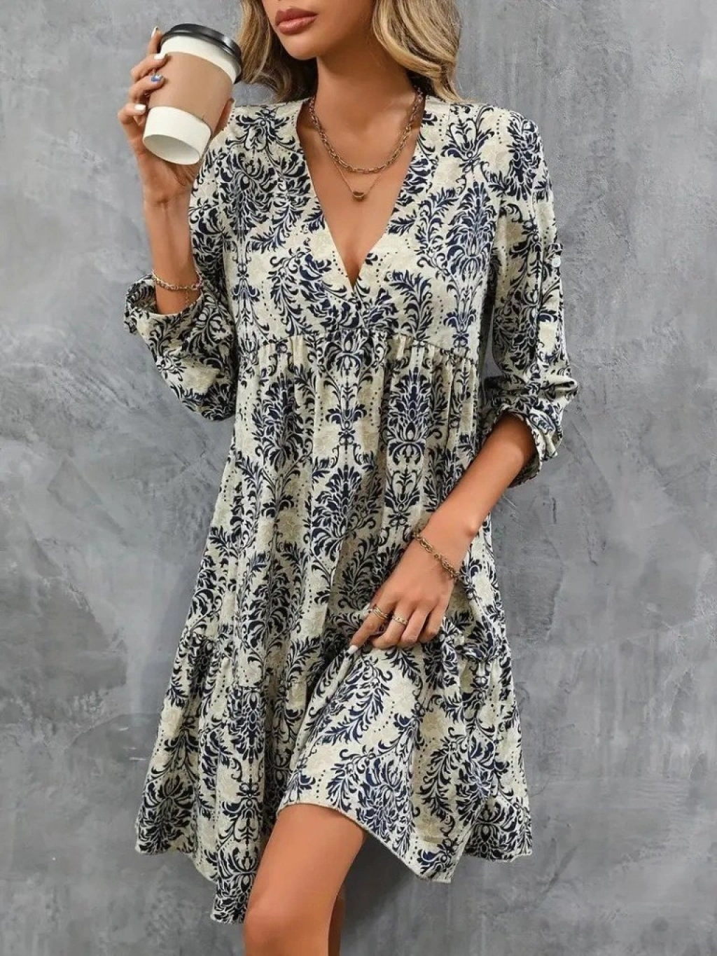 Kadın Uzun Kollu V Yakalı Fırfırlı Mini Süprem Elbise