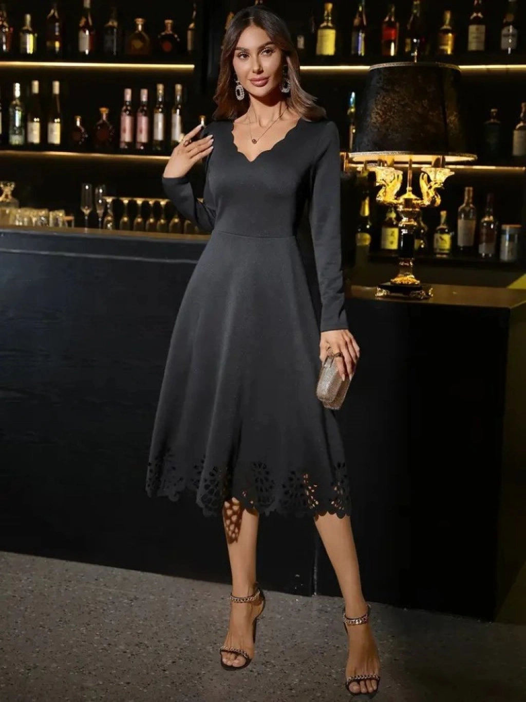 Kadın Uzun Kollu V Yakalı Lazer Kesim Detaylı Midi Ithal Krep Elbise