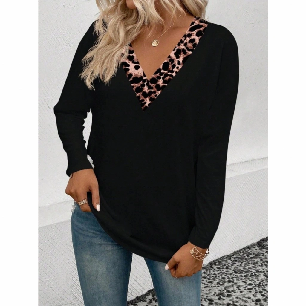 Kadın Uzun Kollu V Yakalı Leopar Detaylı Viskon Iki Iplik Bluz