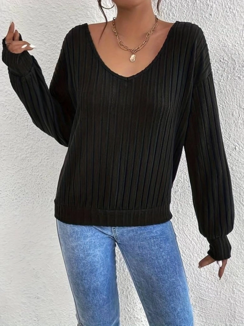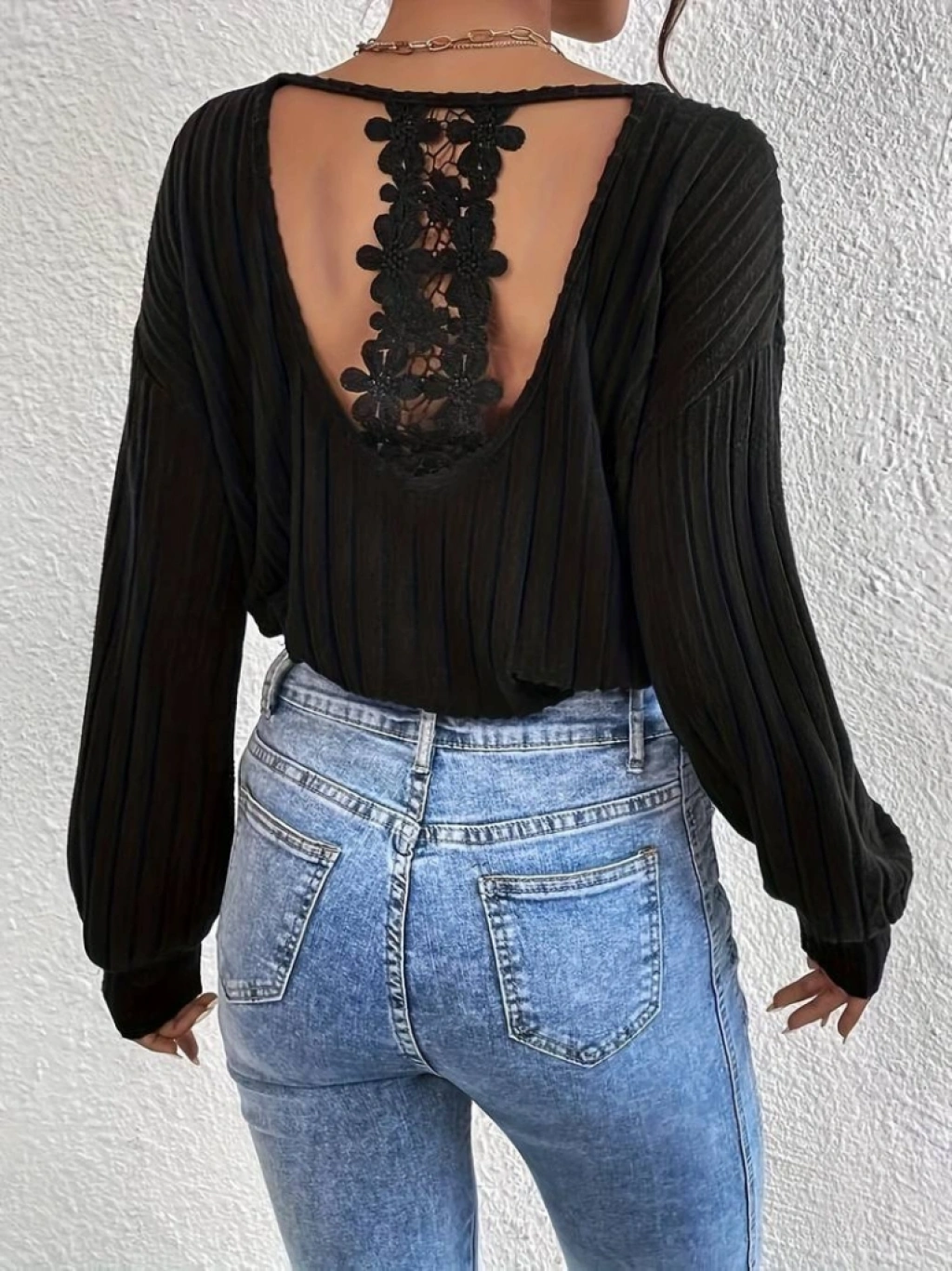 Kadın Uzun Kollu V Yakalı Pencere Sırt Dantel Detaylı Kalın Fitilli Kaşkorse Bluz
