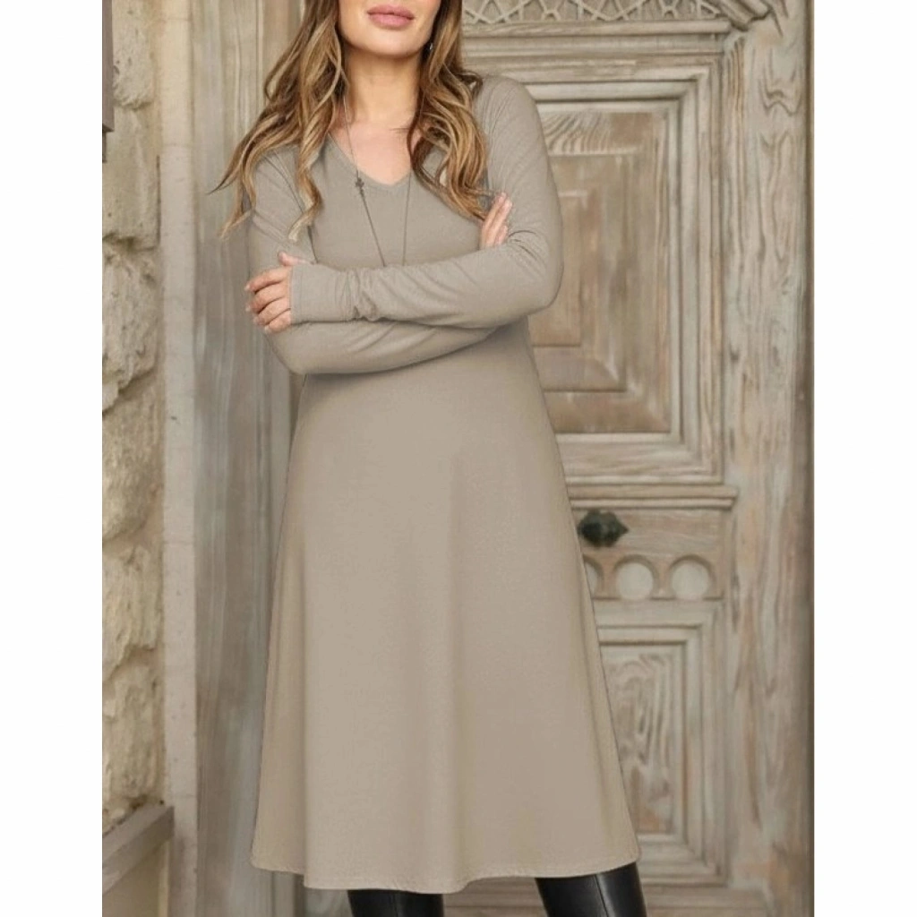 Kadın Uzun Kollu V Yakalı Salaş Midi Akrilik Elbise