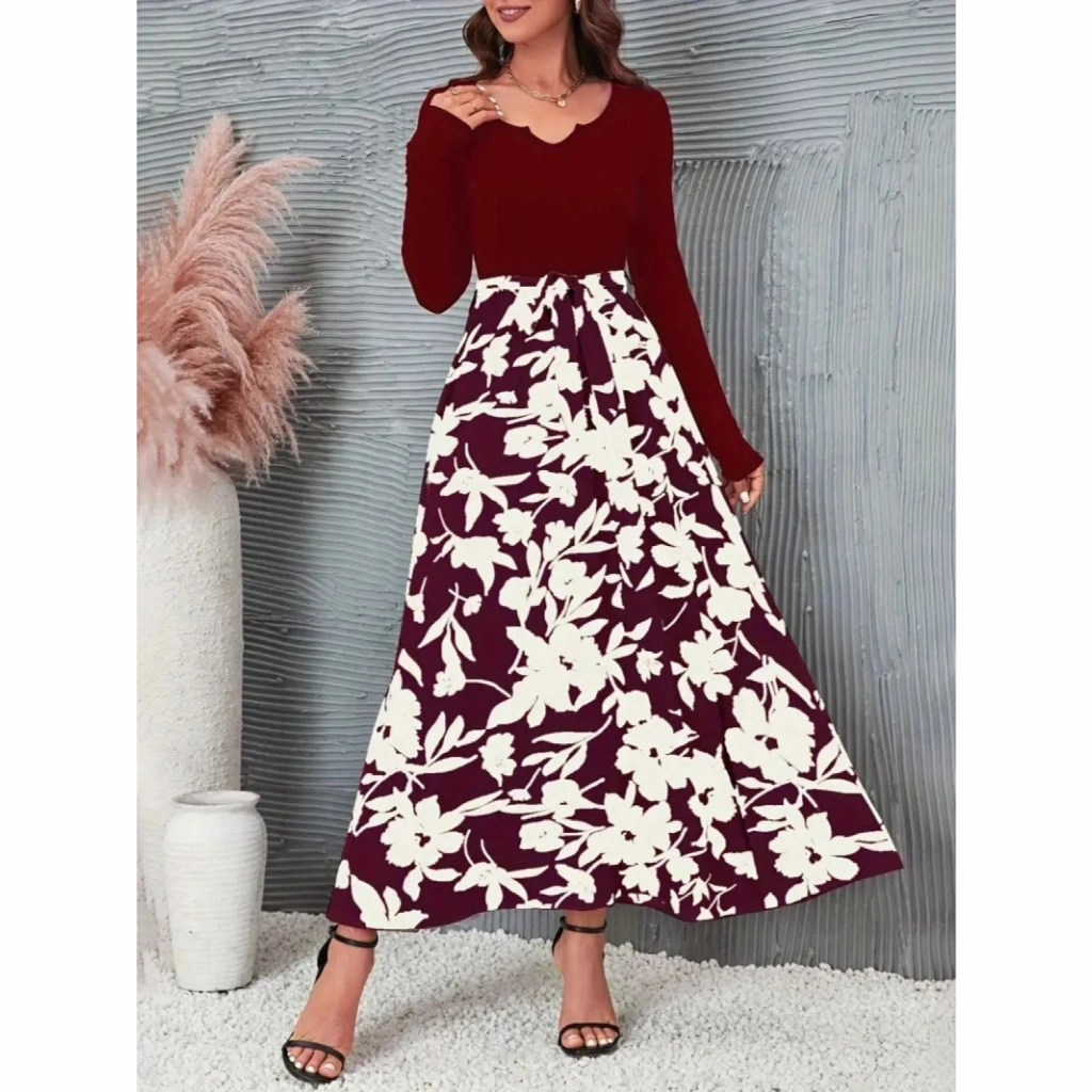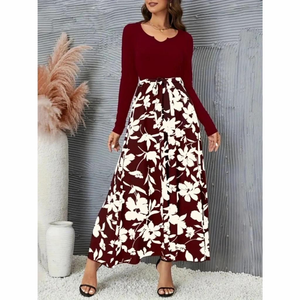 Kadın Uzun Kollu Yaka Açık üst Kaşkorse Beli Kuşaklı Alt çiçek Baskılı Dalgıç Elbise