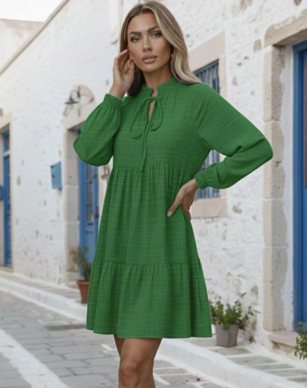 Kadın Uzun Kollu Yakadan Bağcıklı Fırfırlı Keten Mini Elbise